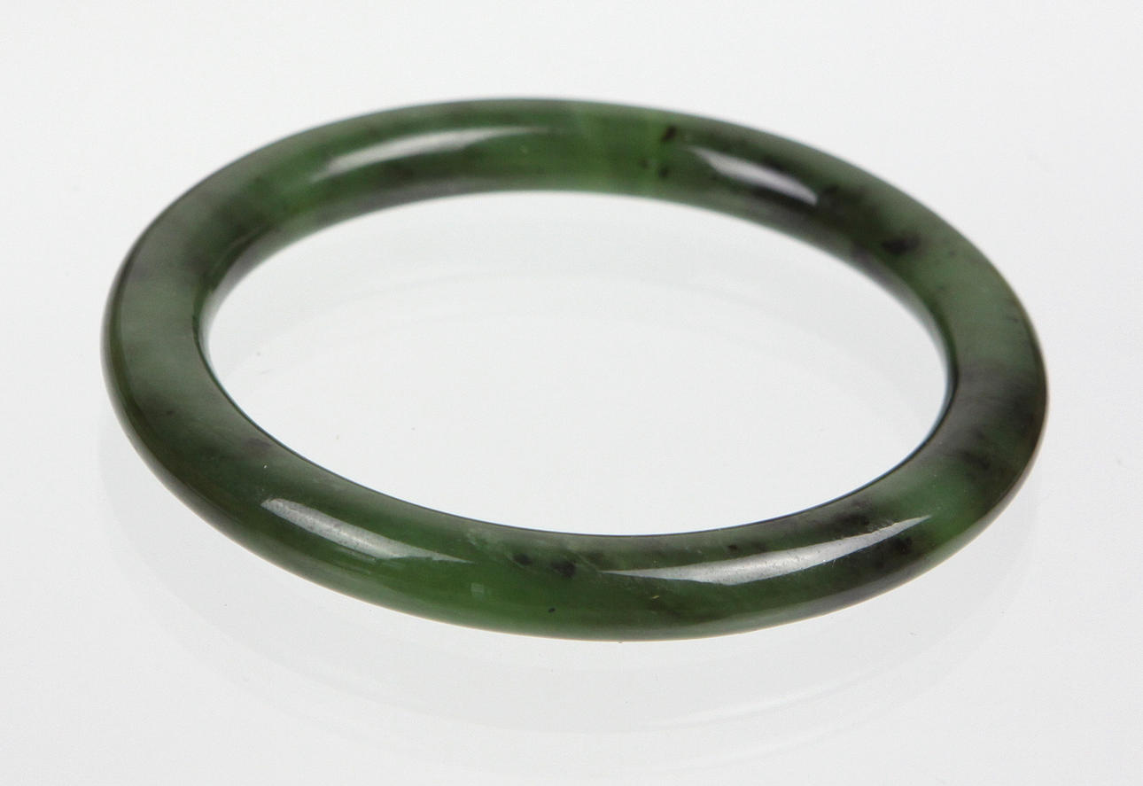Armband i rund solid design, mörkgrön kanadensisk jade med naturligt korn och finpolerad yta, diameter inuti 60 mm, diameter utanför 77 mm, bredd ca.. 8 mm, vikt 37 gram.