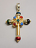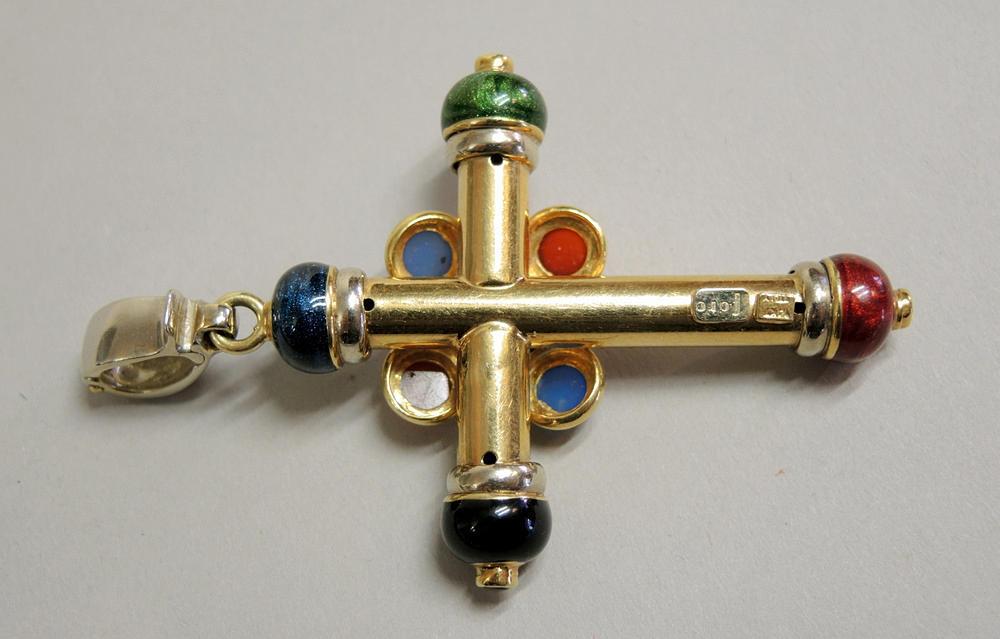 Stort guld kors 18k gult guld, 14k öppning slinga. gult guld, från Pharo, halvädelstenar och ädelsten cabochoner och emaljerade kulor, 7,5 x 4,5 cm, 20 g.