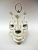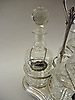 3 slipade glaskaraffer i silverpläterat stativ, karaffer vardera med hamn, whisky och brandy hänge, England omkring 1880, höjd karaffer ca. 29cm.
