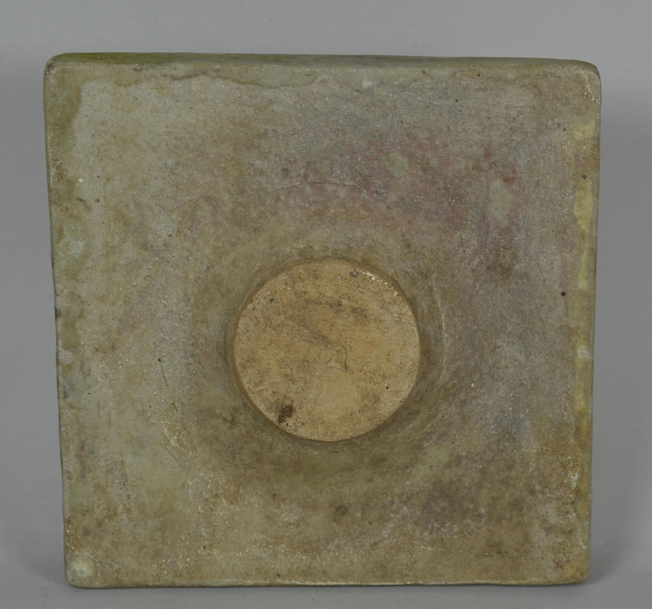 Stengods, glaserad och signerad. H. 4,5 cm, B. 20cm, d. 20cm.