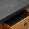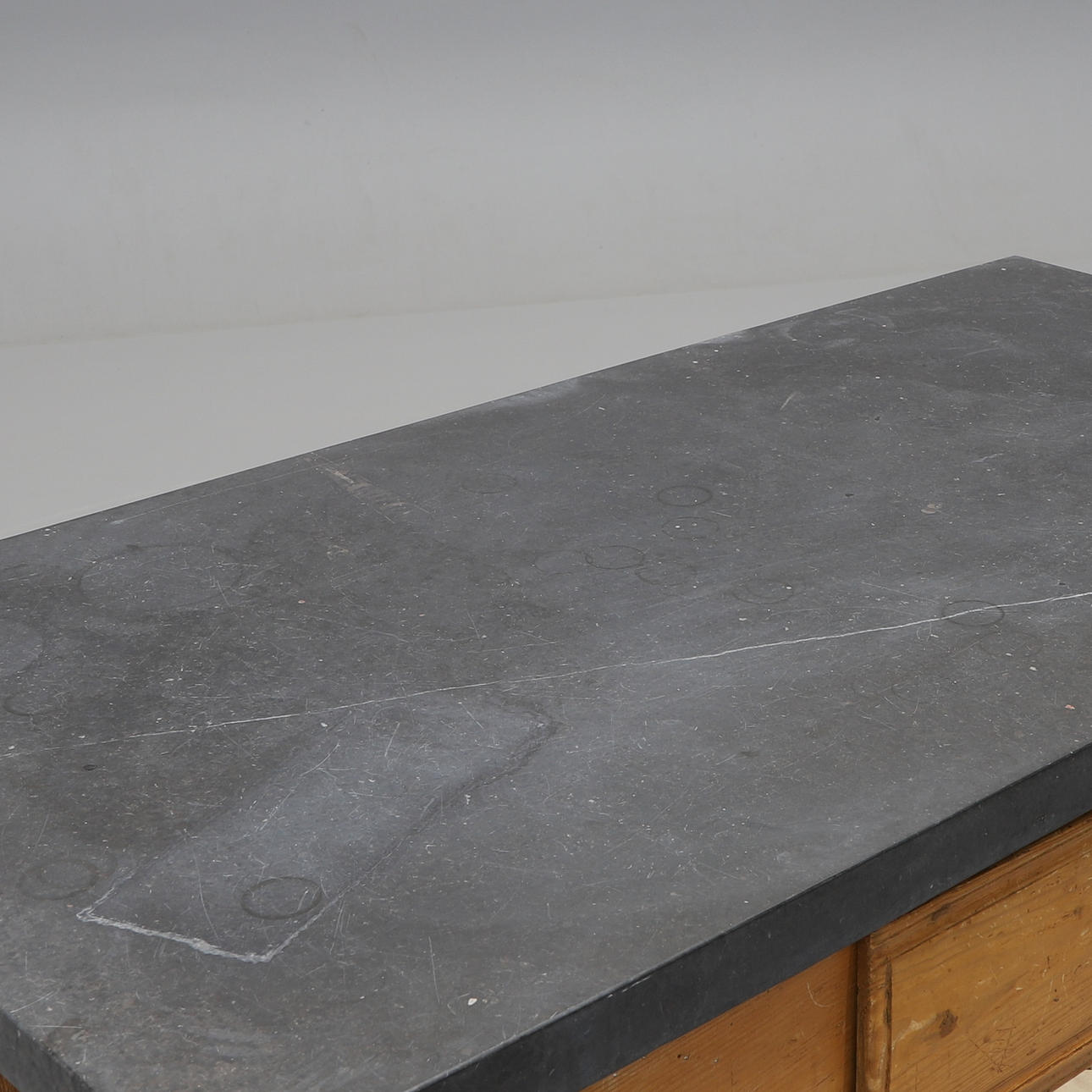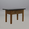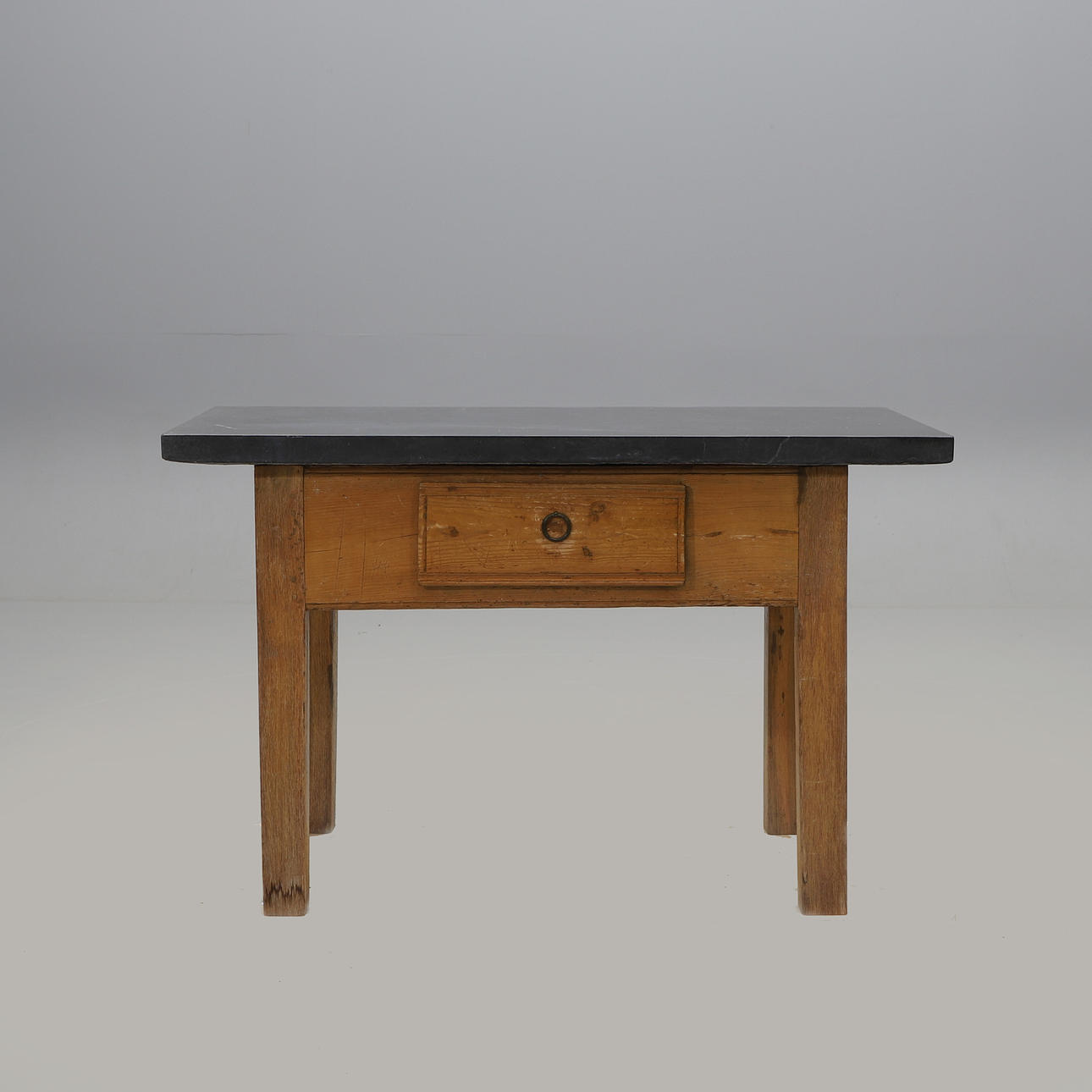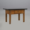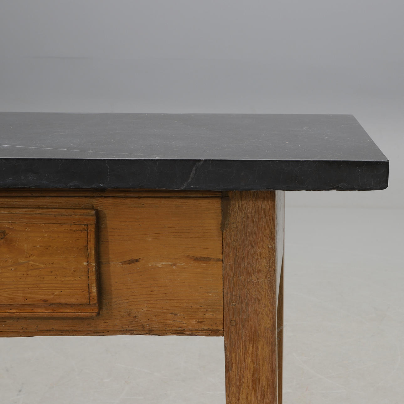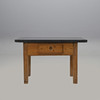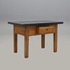 Underrede av ek och furu med låda i sarg. Skiva troligen från Komsta, tjocklek ca 5 cm. Höjd 75, längd 118,5, bredd 62,5 cm.