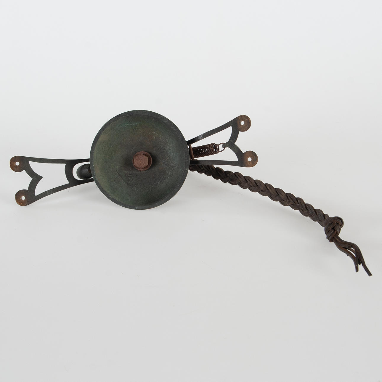 Kupolformad klocka i gjutjärn med fäste för vägg- eller takmontering. Utrustad med ursprunglig flätad läderrem för manövrering av kläppen. Användes för signalering i spårvagnar. Patina efter ålder och bruk.