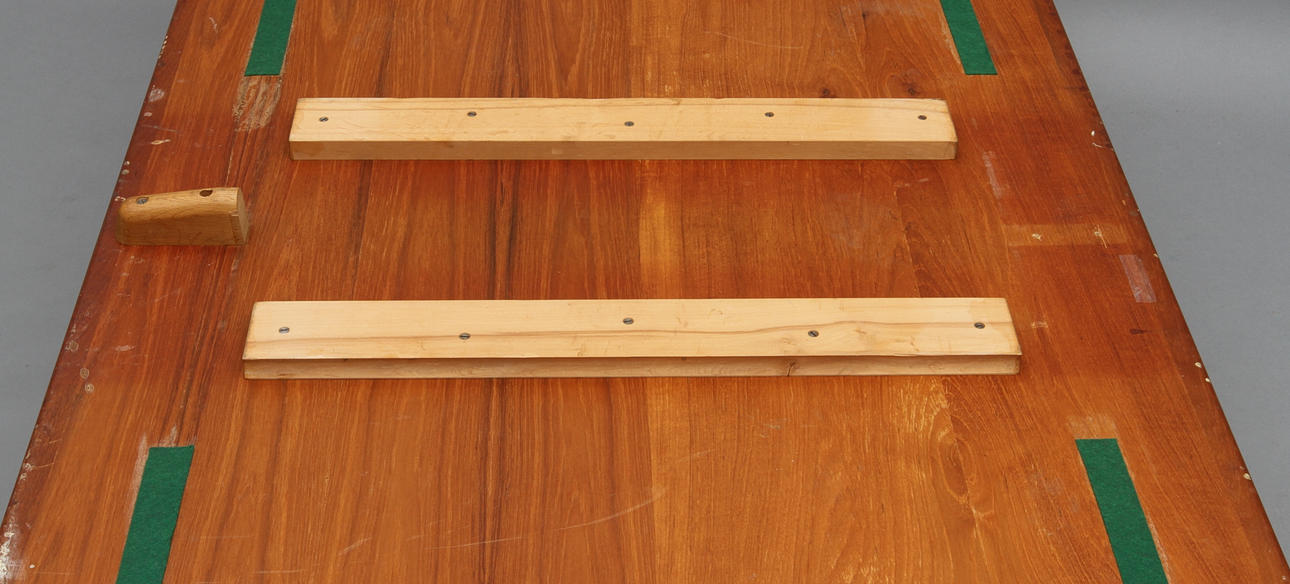 Skiva i teak på benställning i ek. Brännmärkt. Längd 158 (+ 2 utdragbara skivor à 60 cm), bredd 100, höjd 70 cm.
