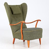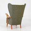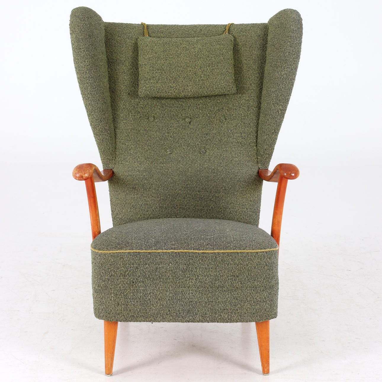 Grön tygklädsel, sitthöjd ca 42, rygghöjd ca 107 cm.