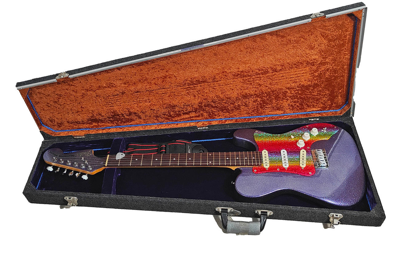 Elgitarr i etui, längd ca. 100 cm, med axelrem.