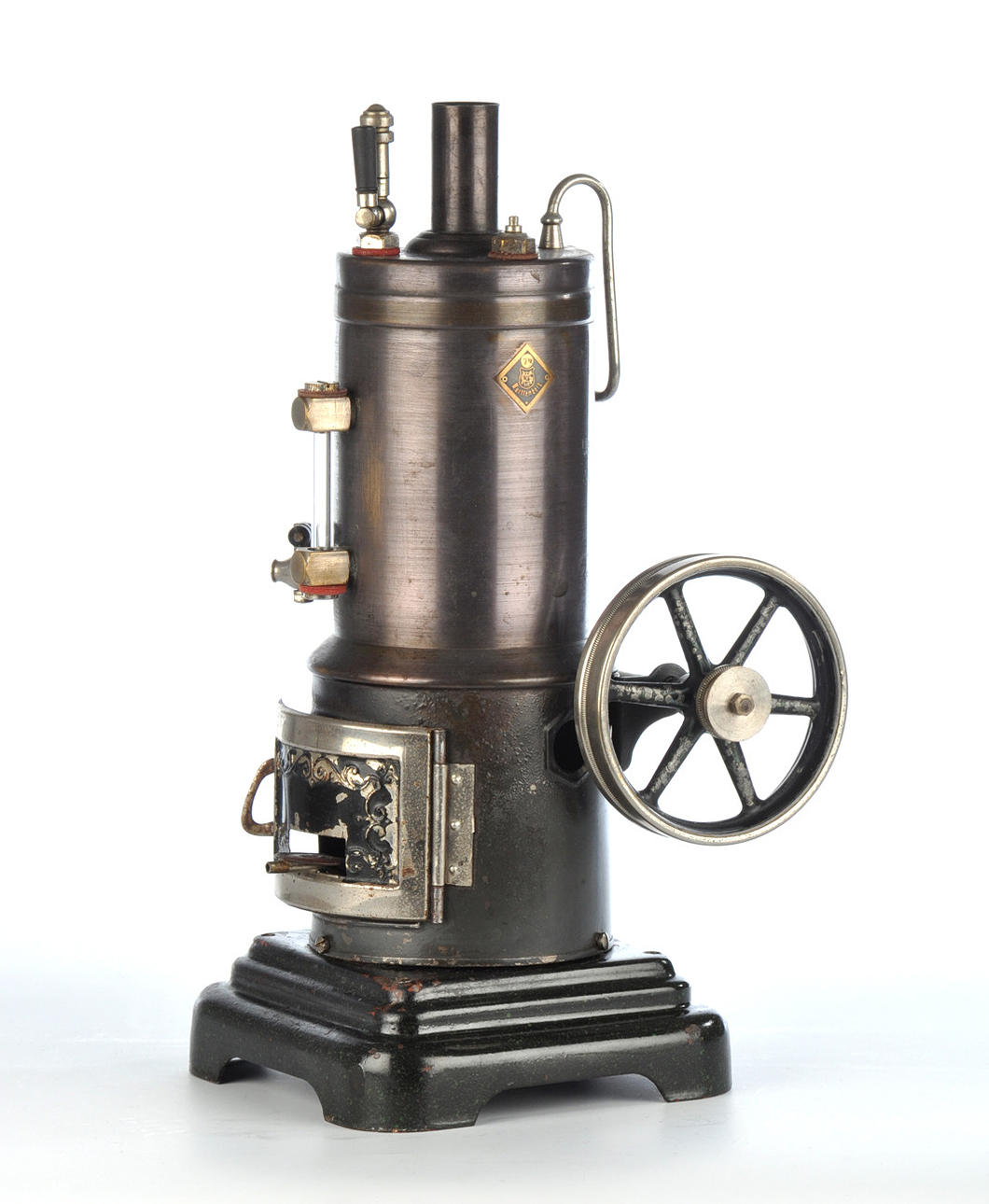 Wilesco. Ångmaskin D 16 i originalförpackningen. - Märklin. Stående ångmaskin, omålad. Höjd 29 cm, bottenmått 12,5 x 12,5 cm.
