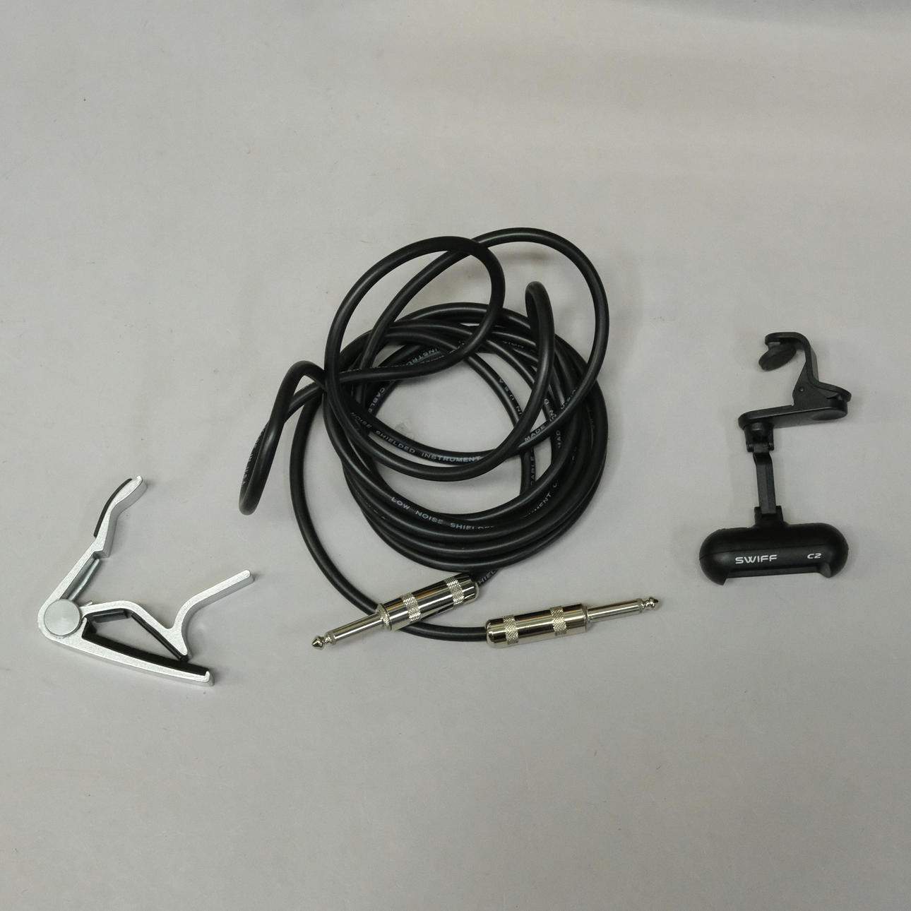 Kabel, längd ca 300cm, gitarr capo, stämapparat, Swiff C2 samt luftfuktare.