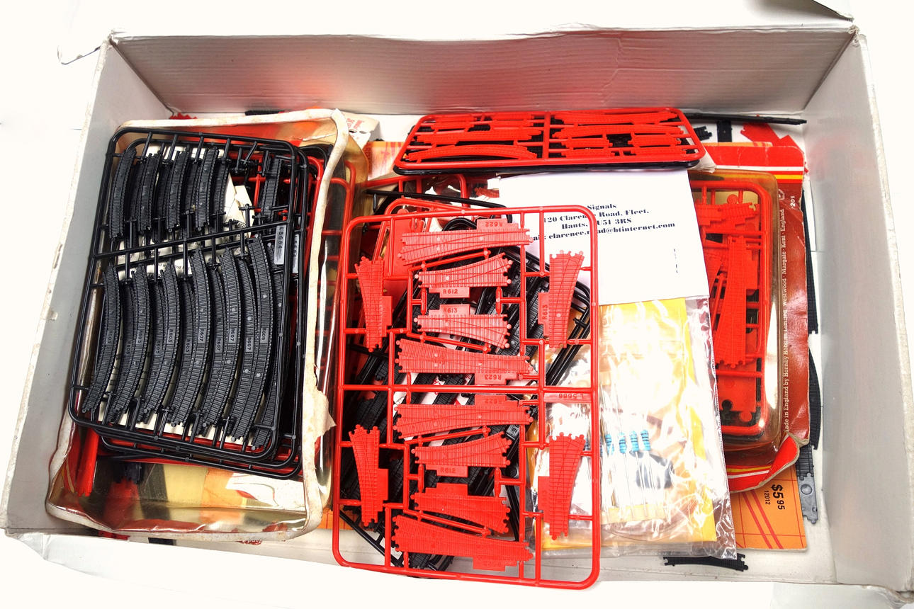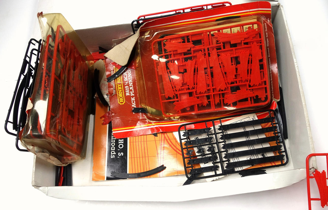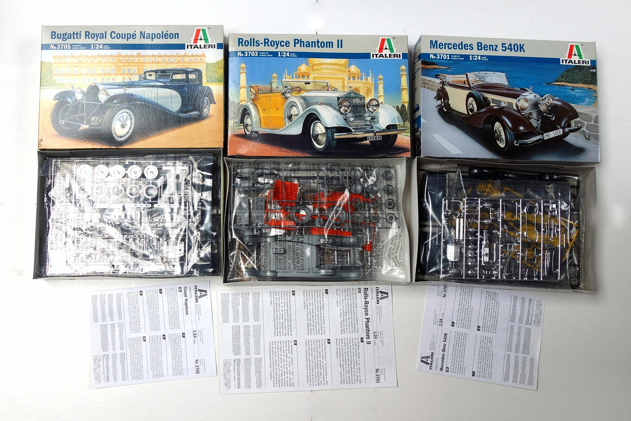 Italeri Bugatti Royal Coupé Napoléon No 3705 1:24 modellsats; Rolls-Royce Phantom II No 3703 kit, Mercedes-Benz 540K No 3701 kit, alla boxade; 2 Revel 1:87 Big Boy Lokomotivbyggsatser, boxade; Bachmann HO Gauge Kolstation, boxad; Tågspår på träd mm, bredd på revelboxar 38,5 cm. (mycket).