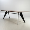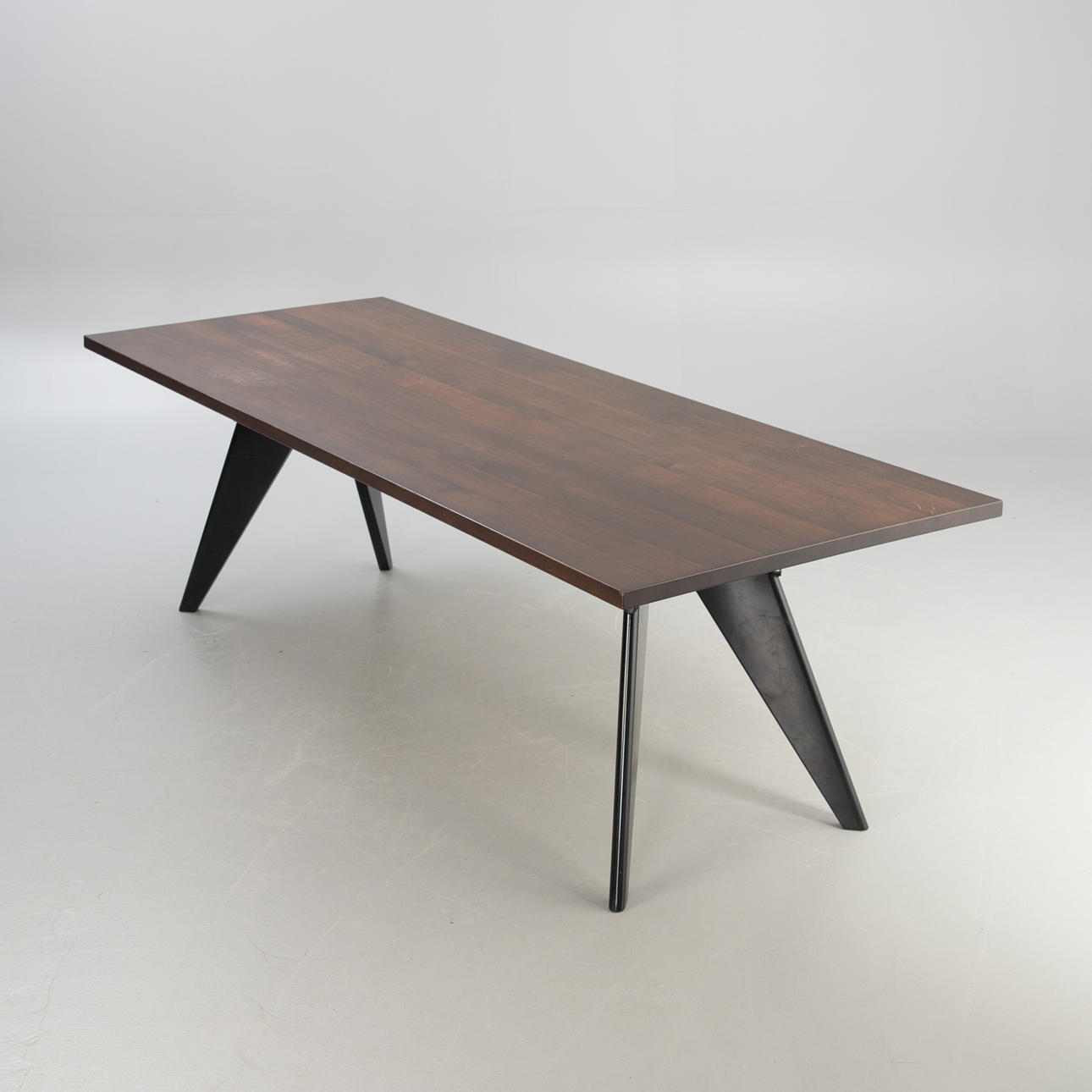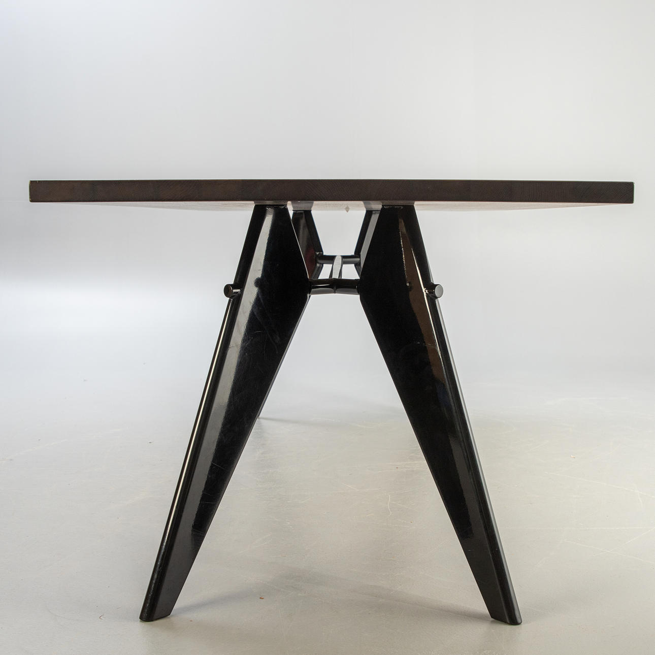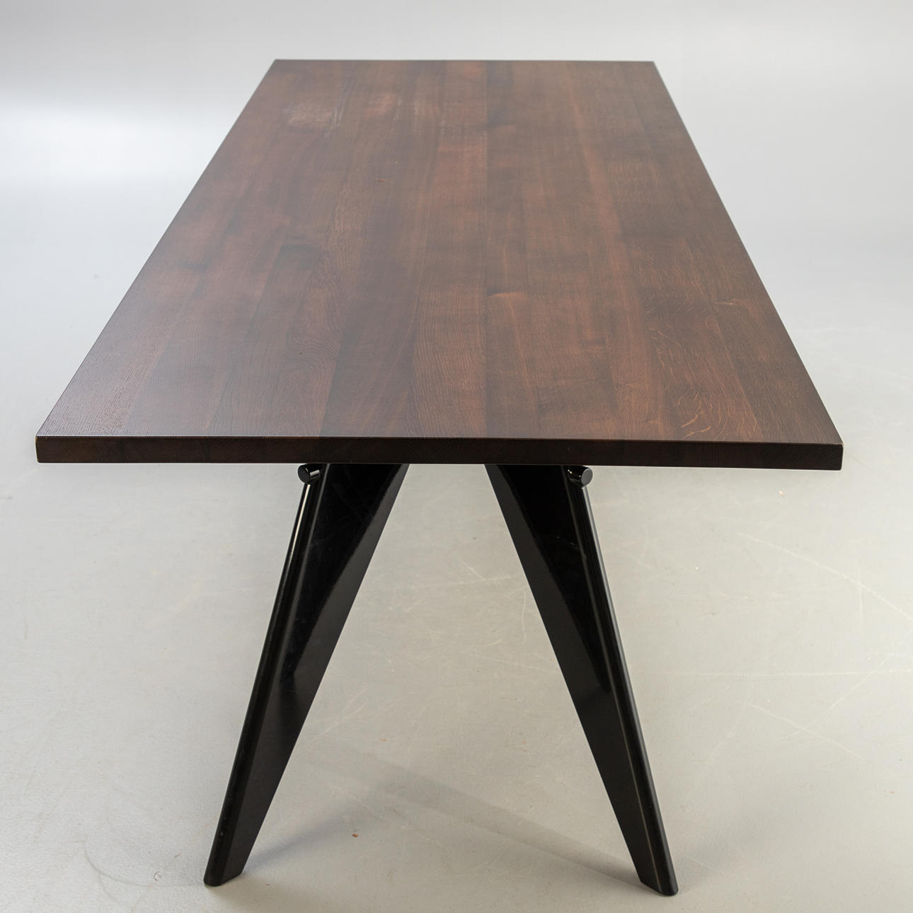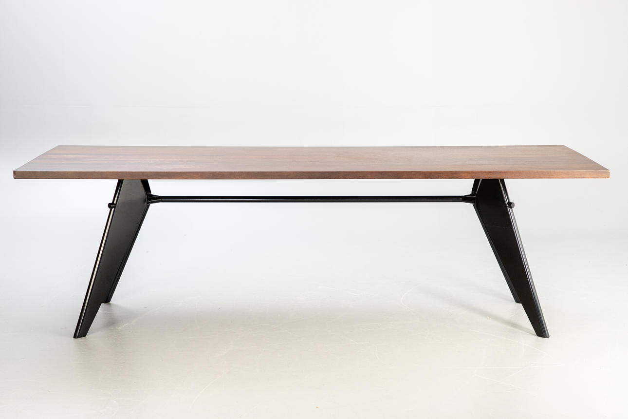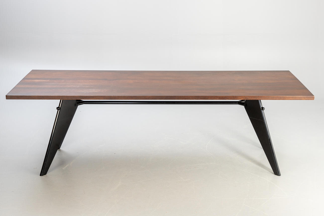Konstruktion: 1950. Bordsskiva fanerad i mörk ek. Bas av stål, pulverlackerad i djup svart.
