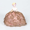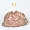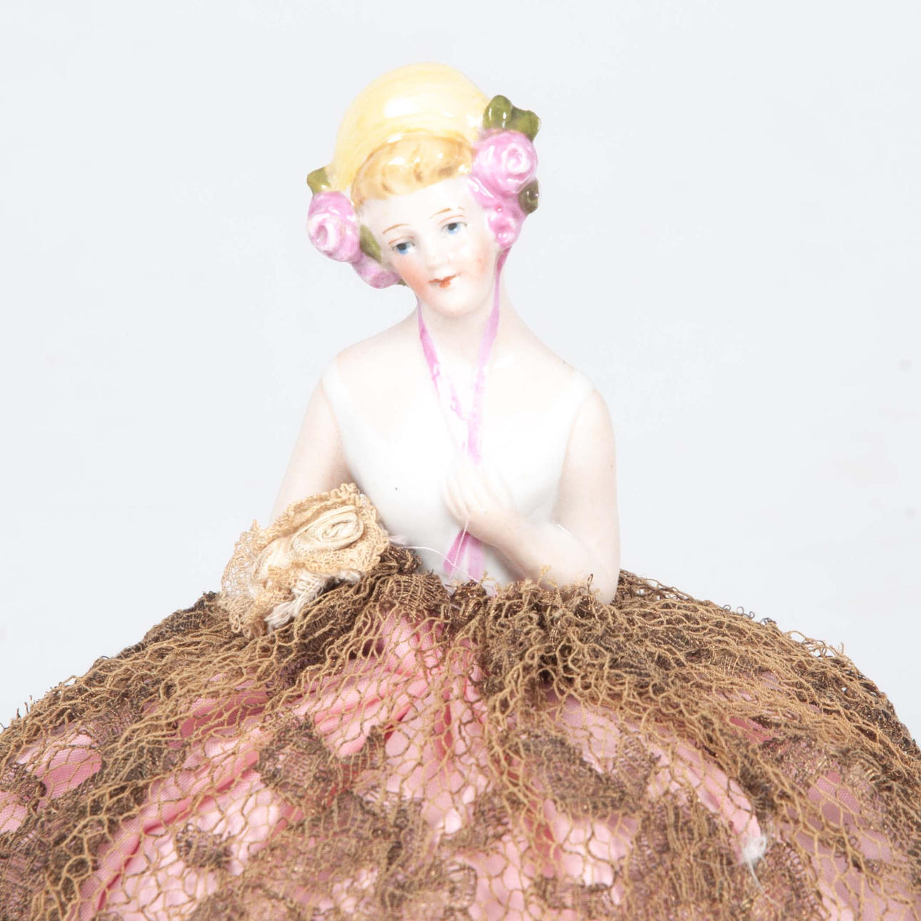 Byst i målad porslin föreställande ung kvinna med blont hår och rosor i håret, klädd i rosa klänning med guldfärgat spetsöverdrag. Underkjol i rosa tyg, stoppad kudde. Höjd ca 17 cm.