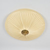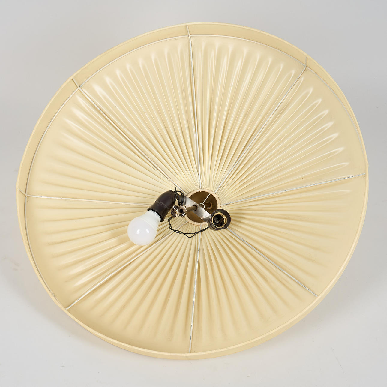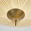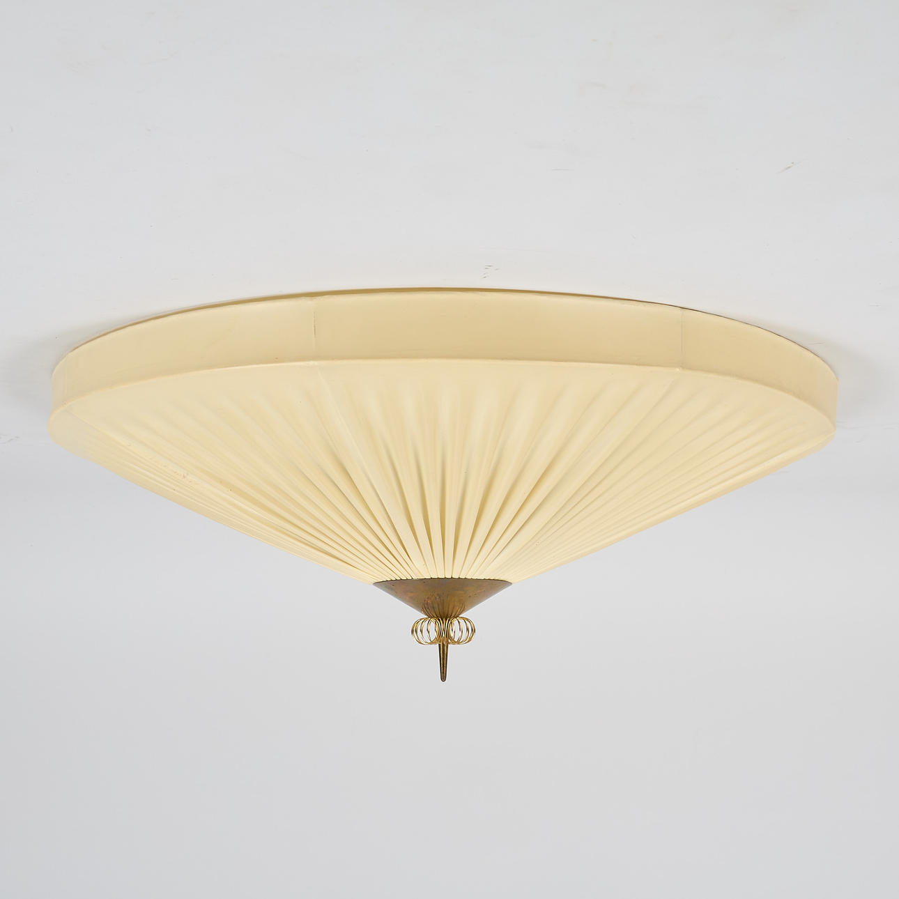 Polerad mässing och plisserad plast lampskärm. Två ljuspunkter. Diameter 70 cm, höjd ca 27 cm.