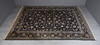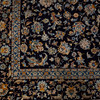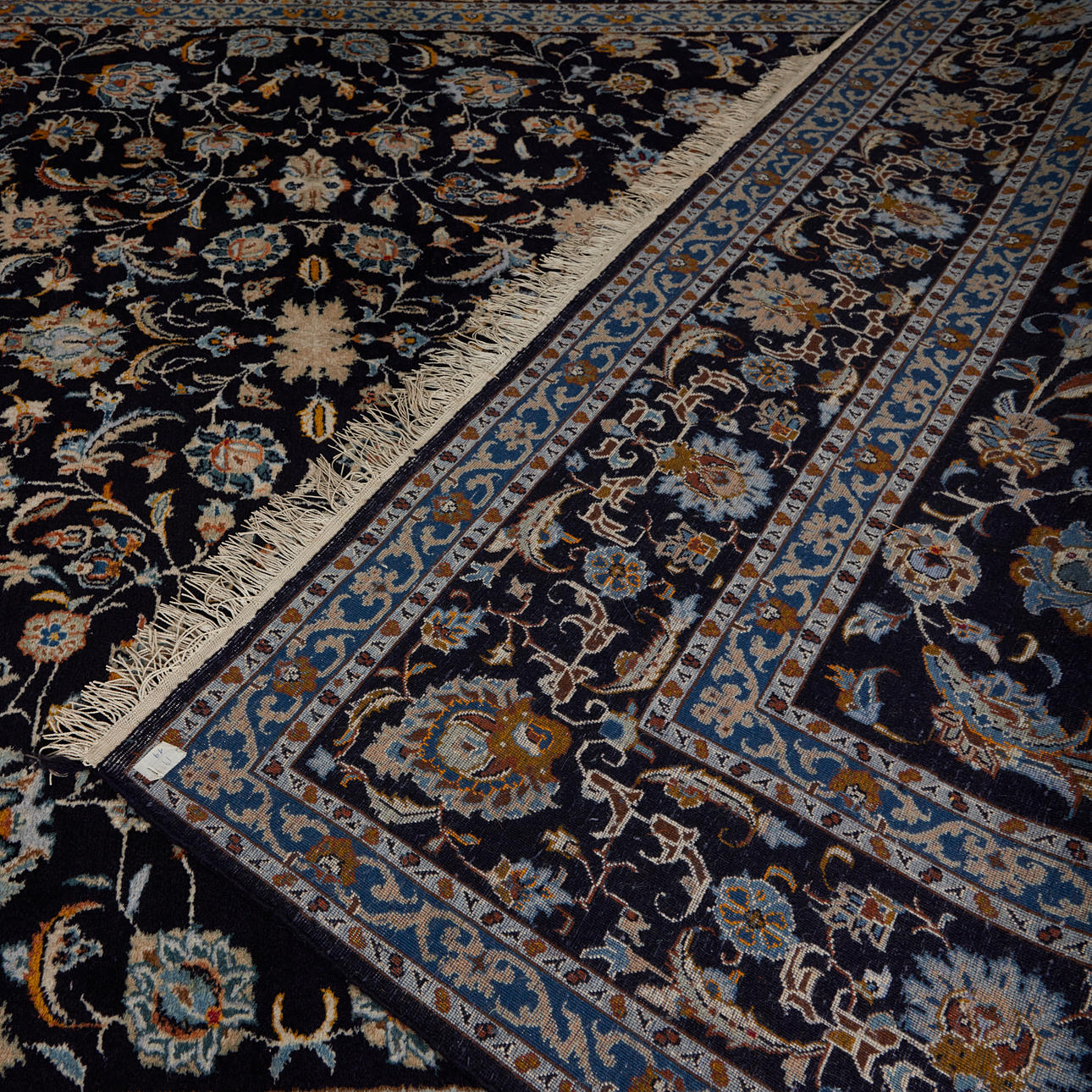 Stor Keschan matta/golvmatta med stiliserad växtdekoration på en mörkblå bakgrund. Mått: 380 x 280 cm.