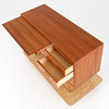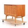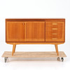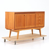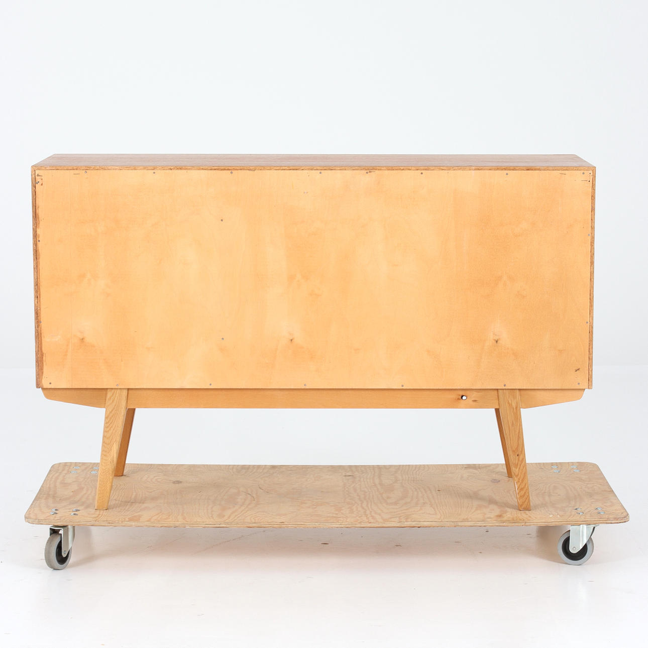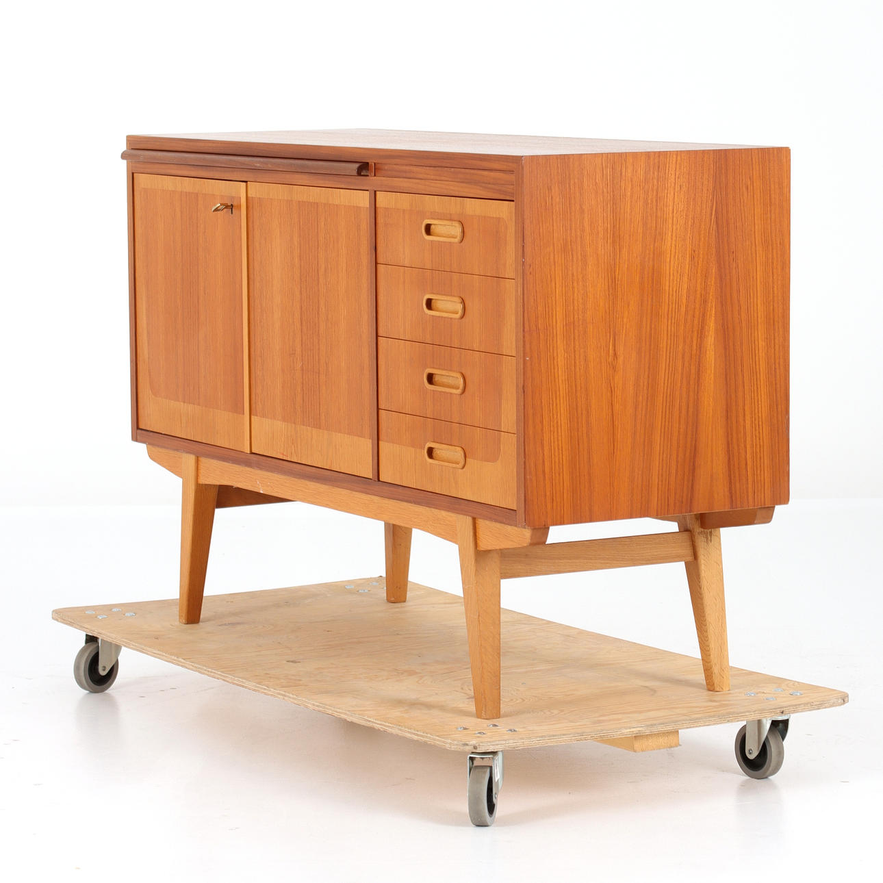4 lådor, skrivskiva, skåpdörrar med bakomliggande hyllplan. Längd 115, bredd 42, höjd 72 cm.