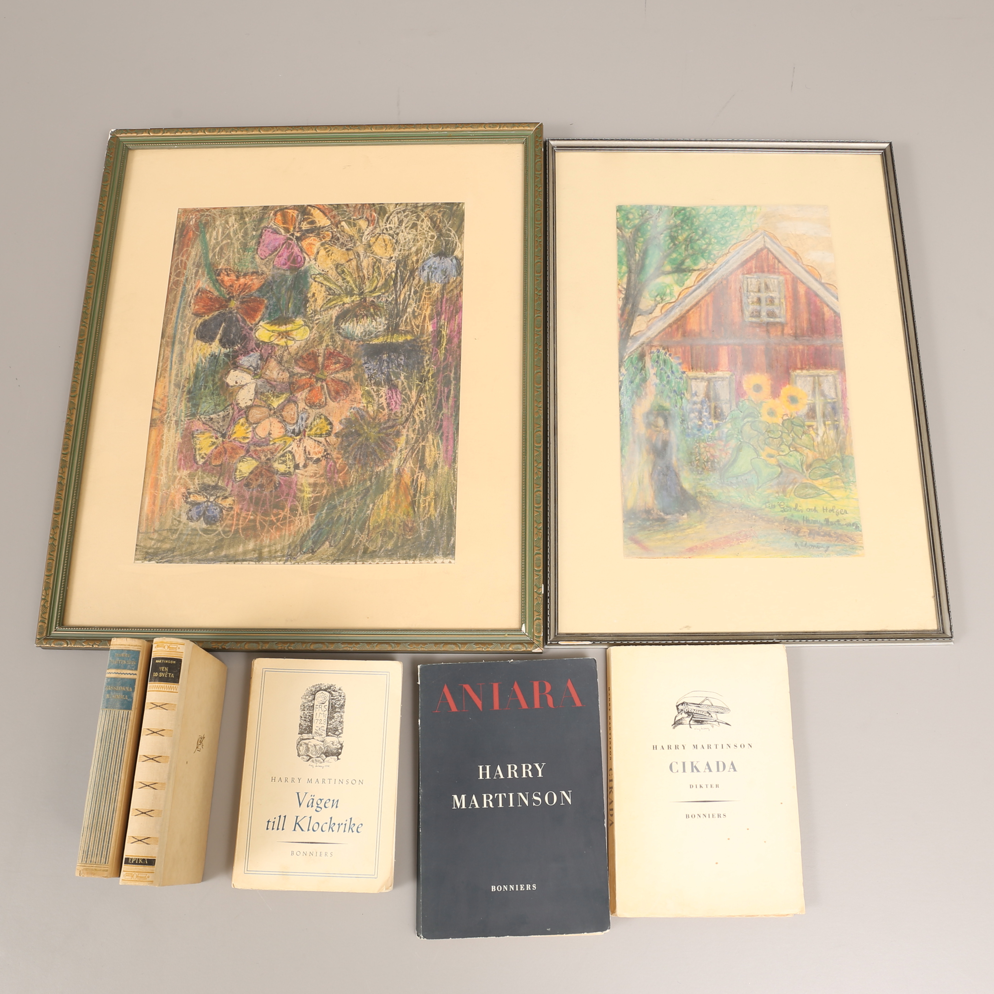 447067. HARRY MARTINSSON. Pasteller, 2 st och 5 böcker .