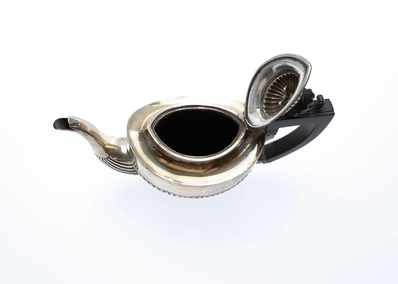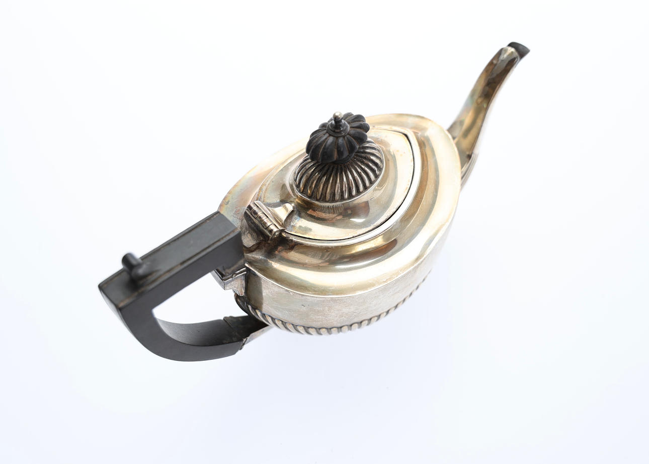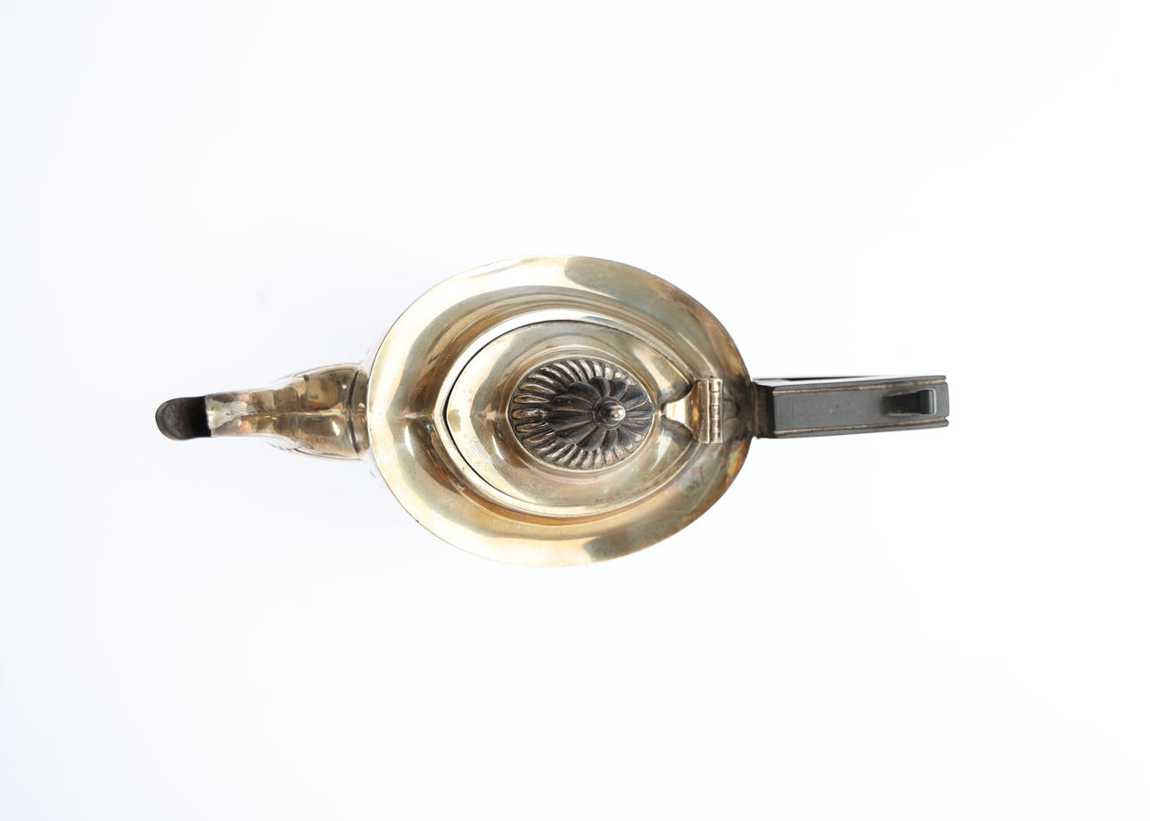 Av klassisk form med halvvassad kropp och eboniserat handtag och finial, av John Rose, Birmingham, 1909, H.12 x W.22cm, brutto 238gr.