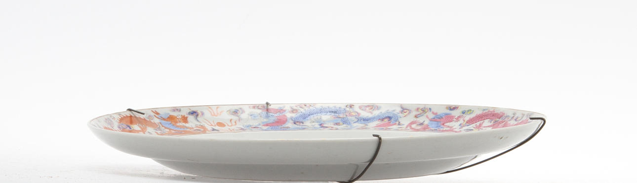 Porslin. Kanton. Dekor av påfågel och insekter vid blomma samt brätte med drakar.