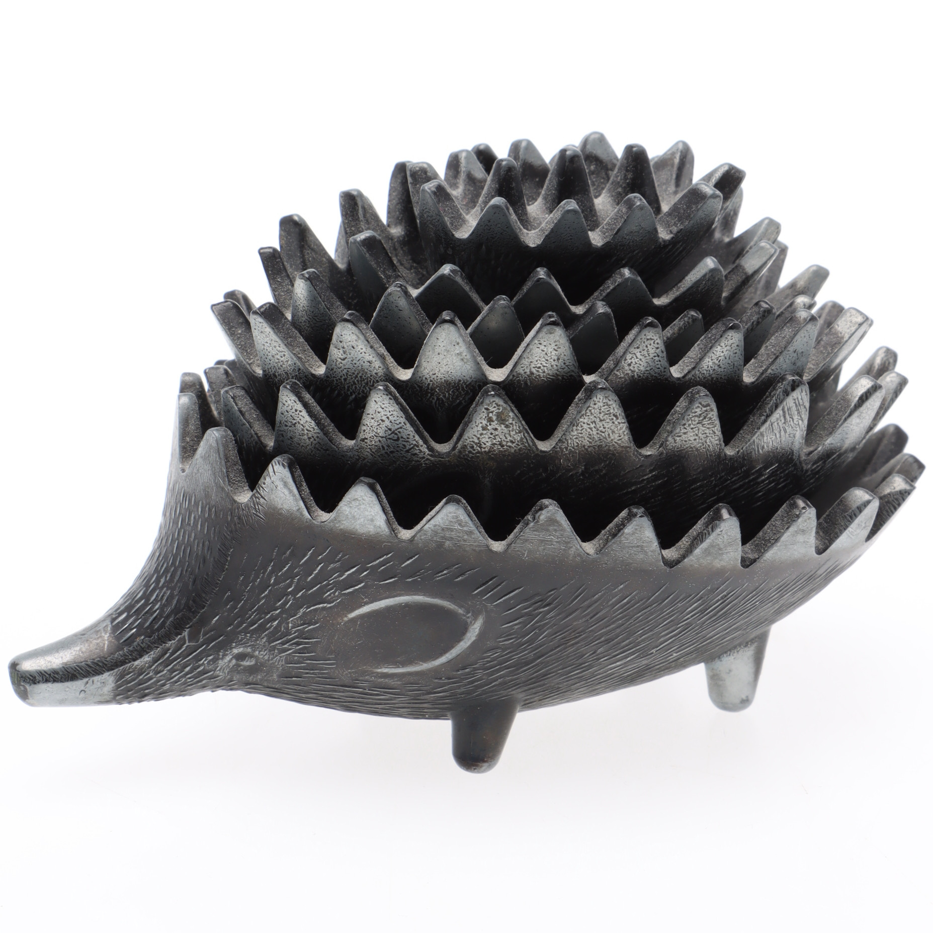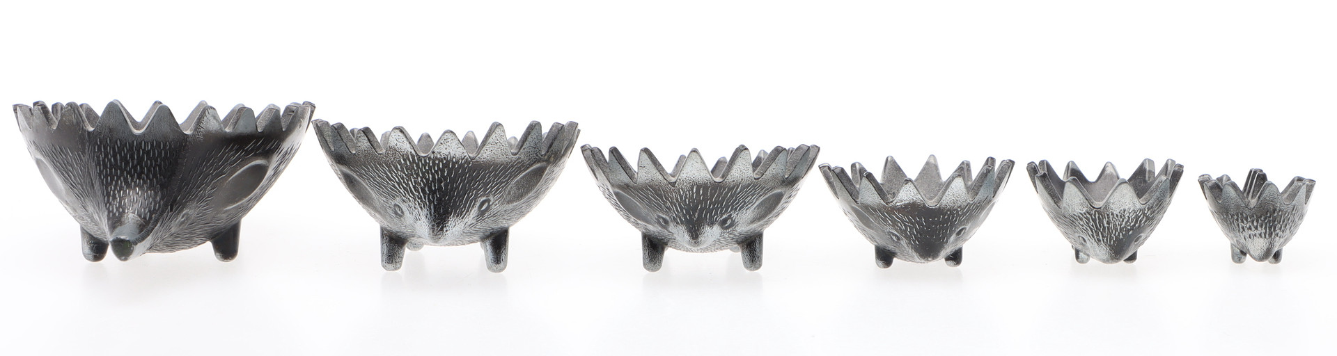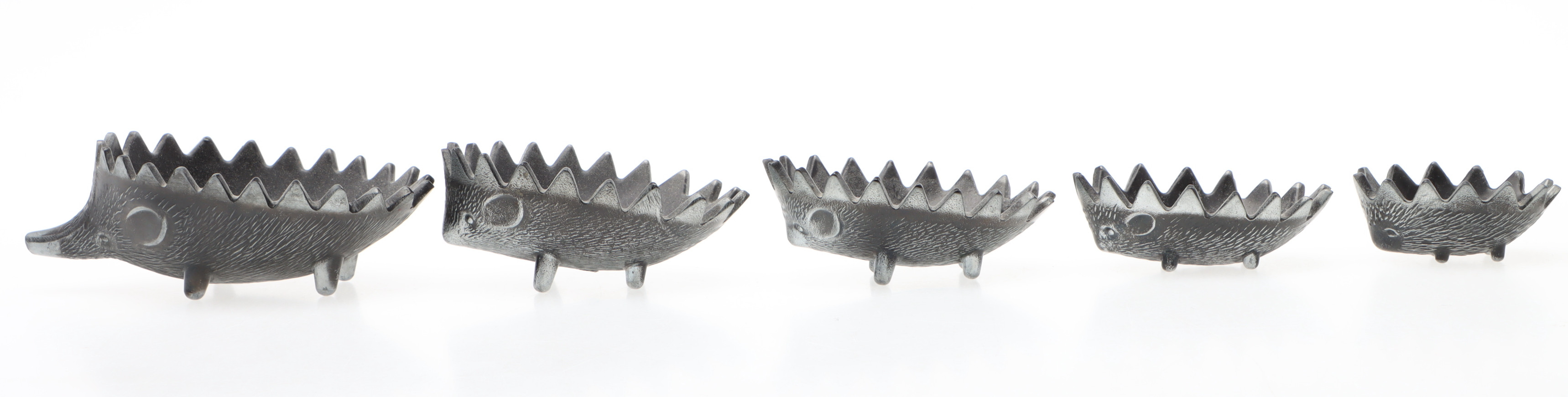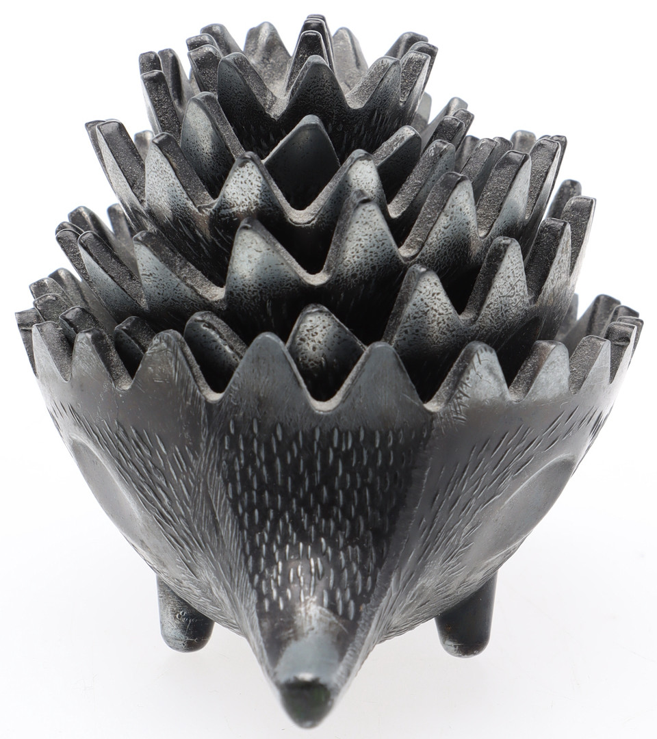 4477121. ASKFAT, 6 st, Igelkottar, metall, stapelbara, efter Walter Bosse.