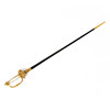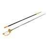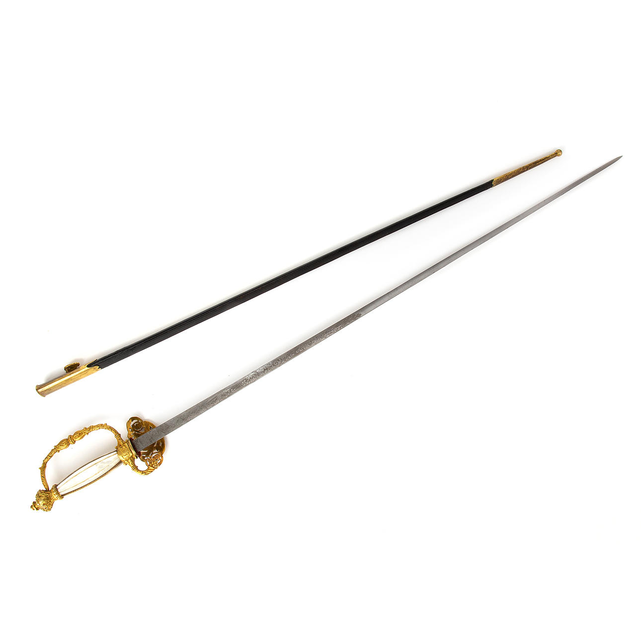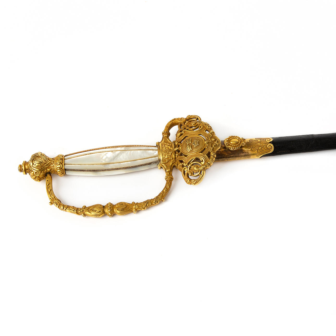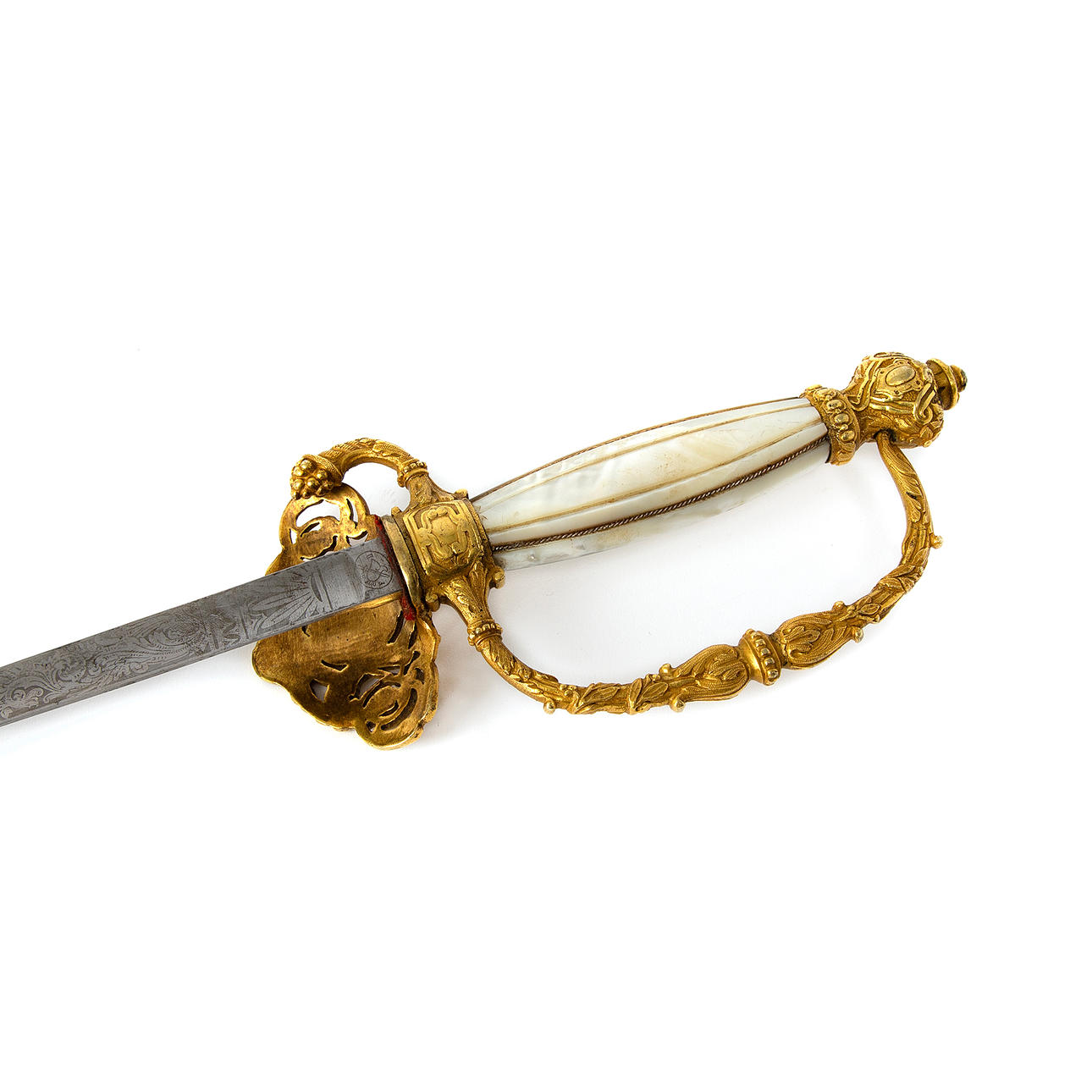Förgyllt mässingsfäste a clavier med genombruten parerplåt med lilla riksvapnet. Grepplattor i pärlemor. Stukatklinga och läderbalja med två beslag. Längd ca 93 cm.