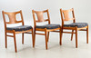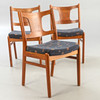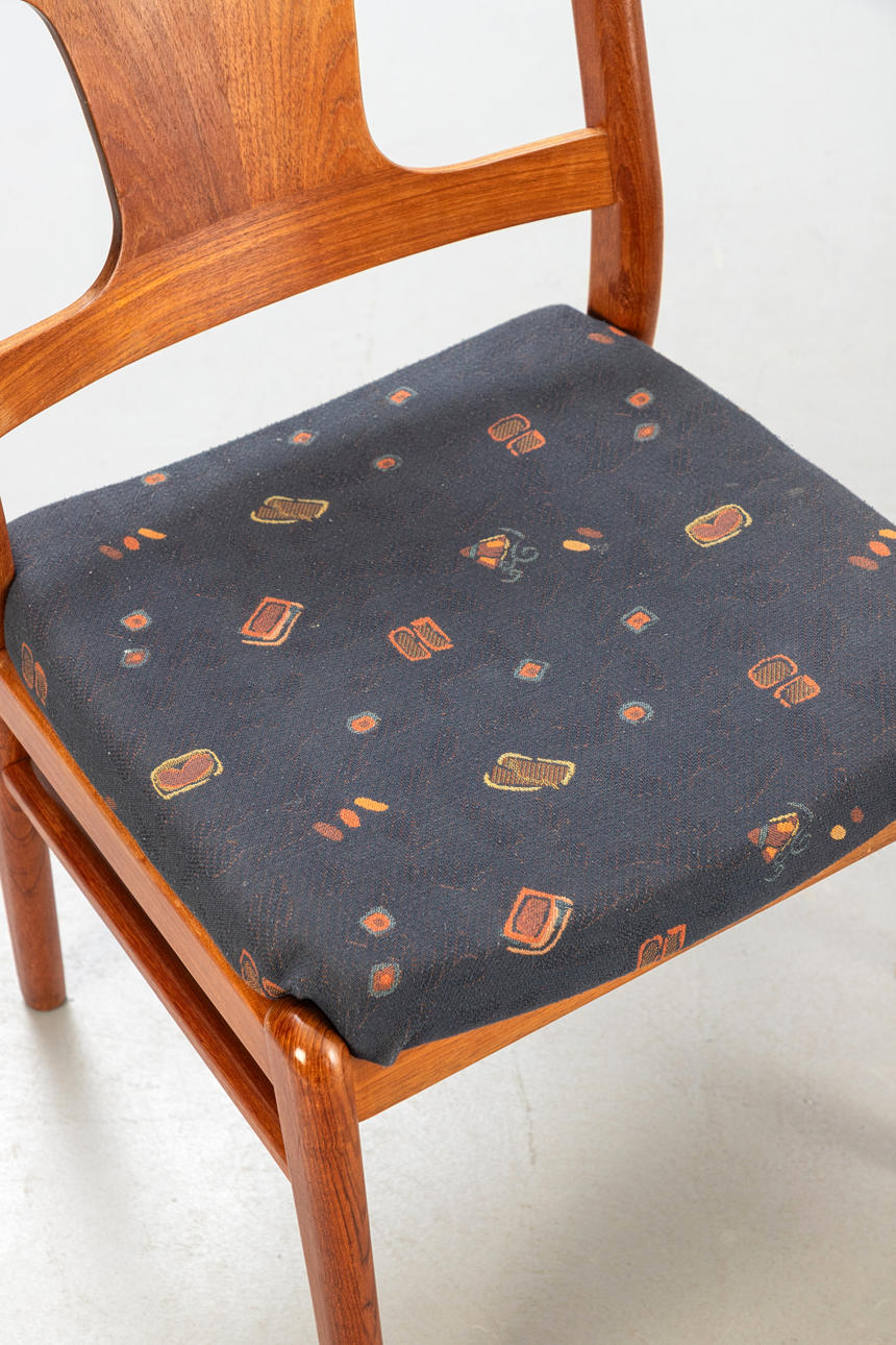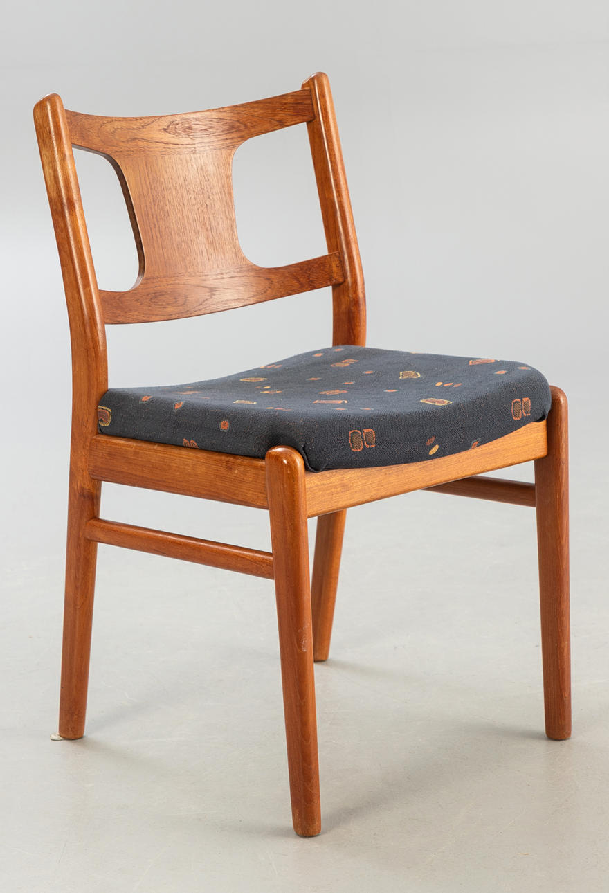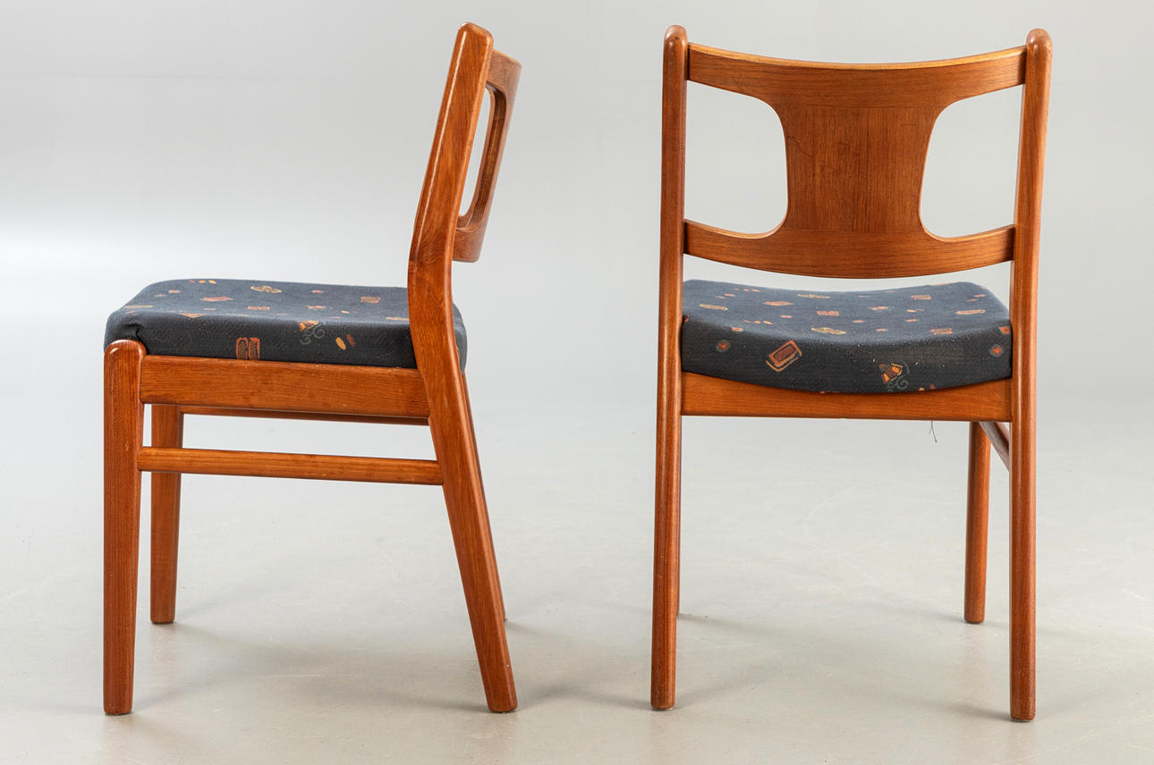 Ramar i teak, stoppade och klädda med tyg. ca H 84 cm, B 46 cm, D 44 cm, Sh 47 cm.