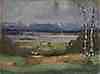 olja/kartong. 24 x 32 cm R. u. tecken.: E.R.Lechner. Representation av en sjö med berg.