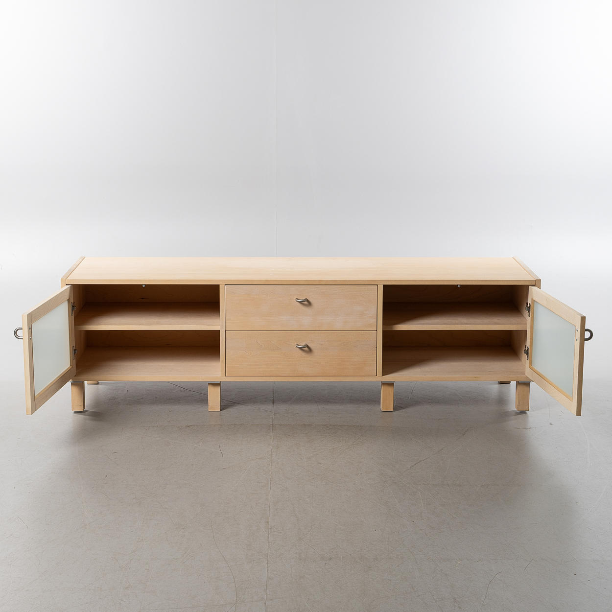 2 lådor samt 2 dörrar med frostat glas, höjd ca 50. 172,5 x 51 cm.