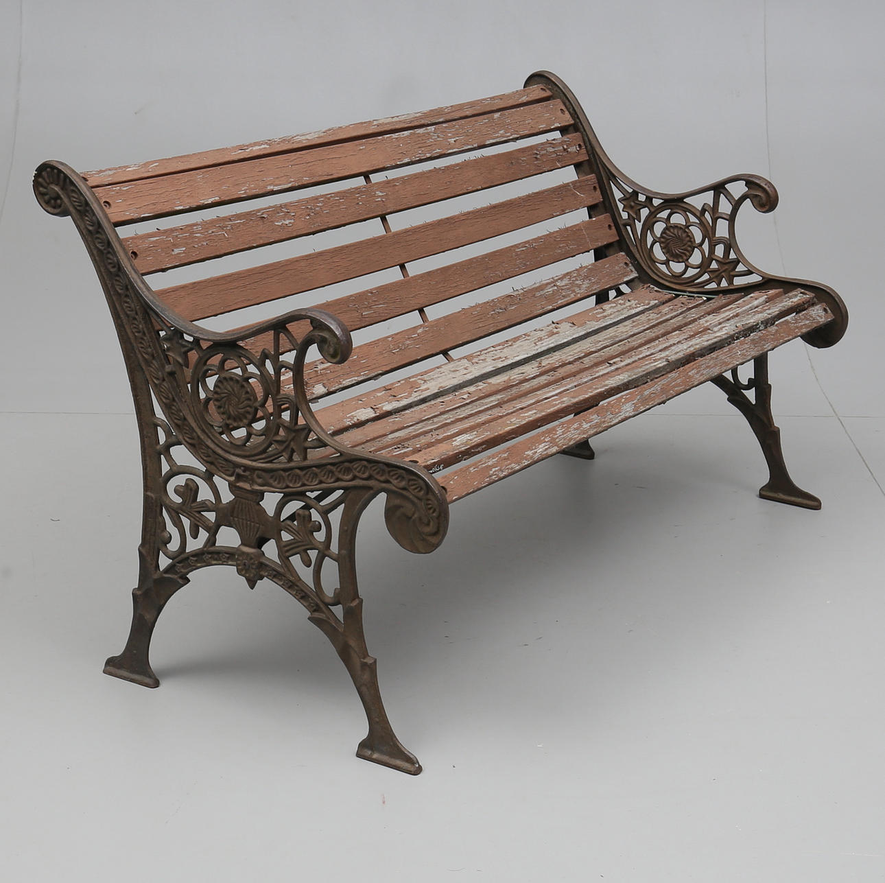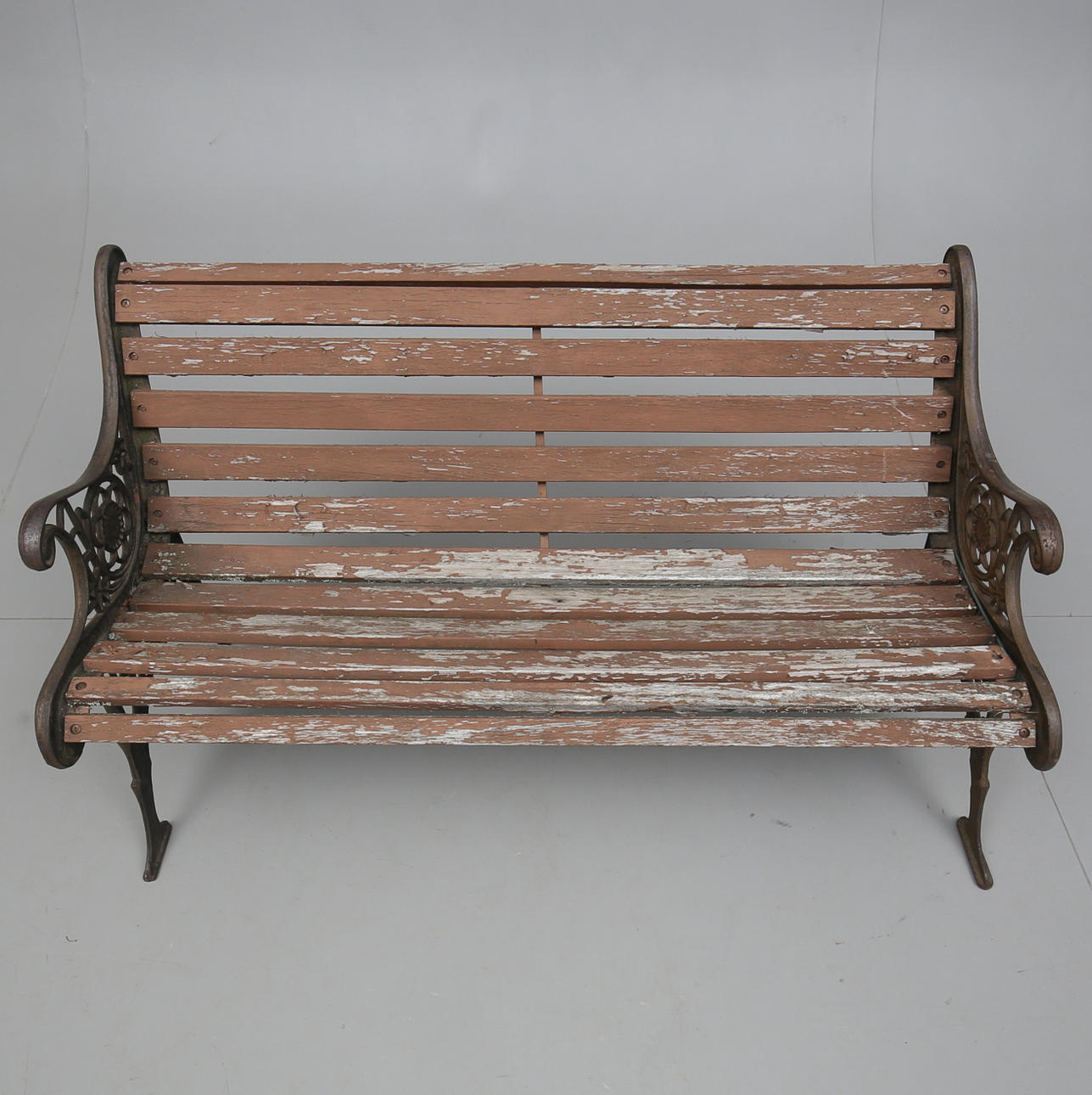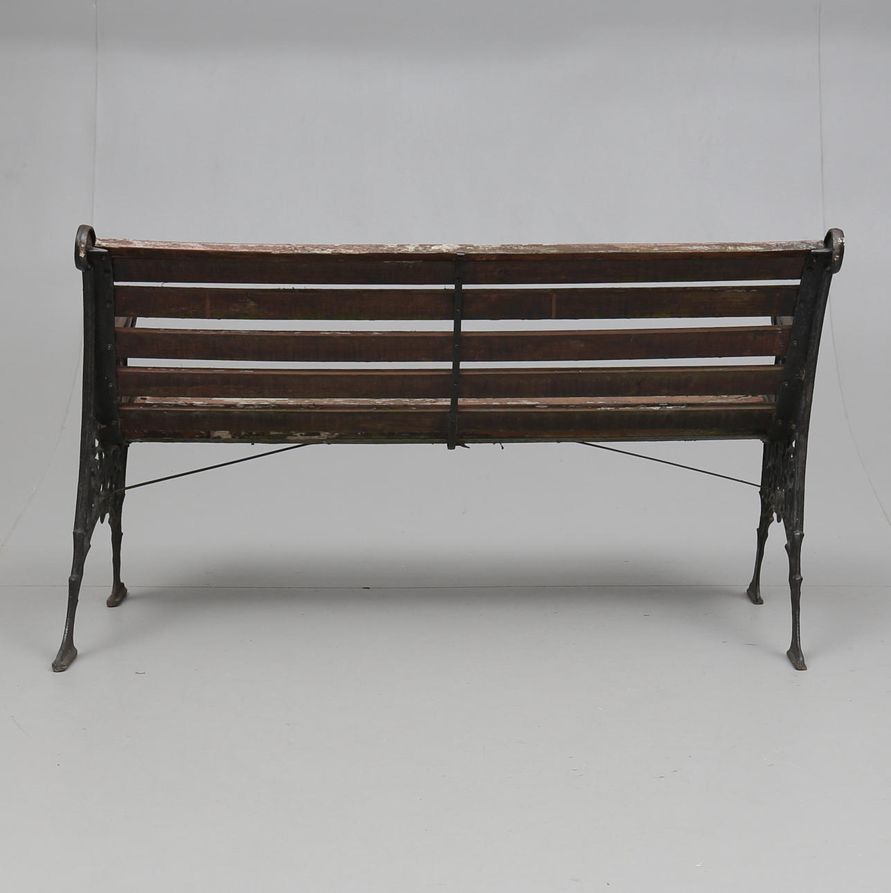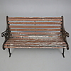 Gavlar av gjutjärn. Sits och rygg av träribbor. Längd ca 125 cm.