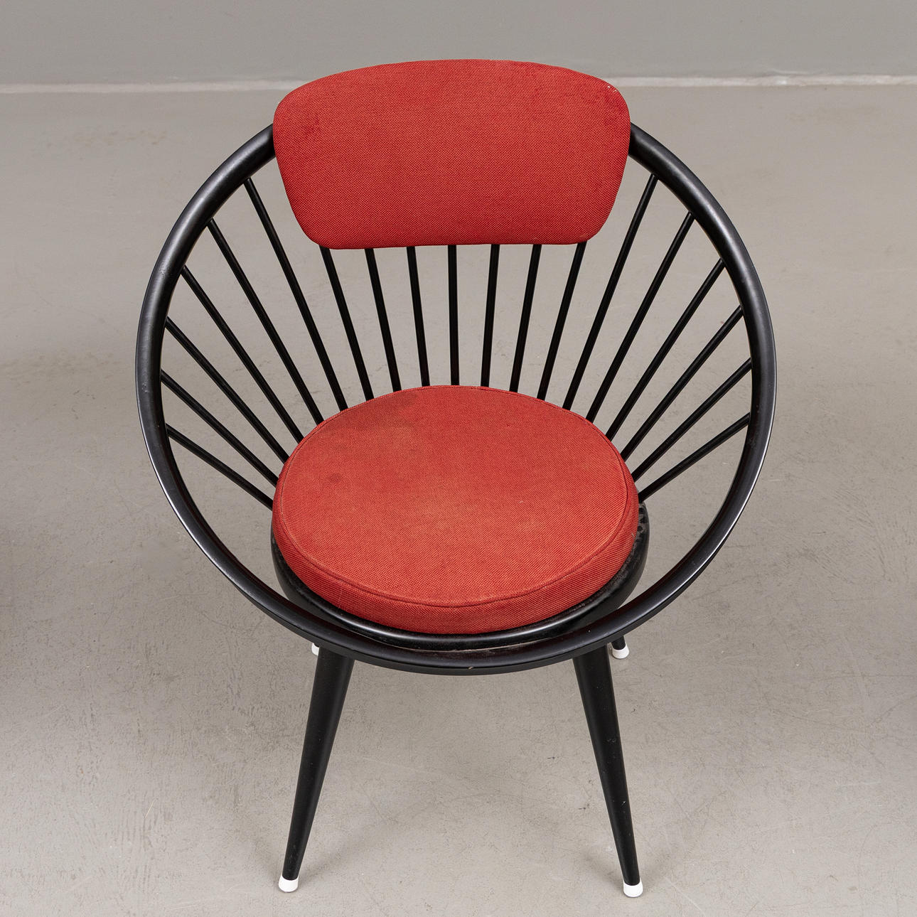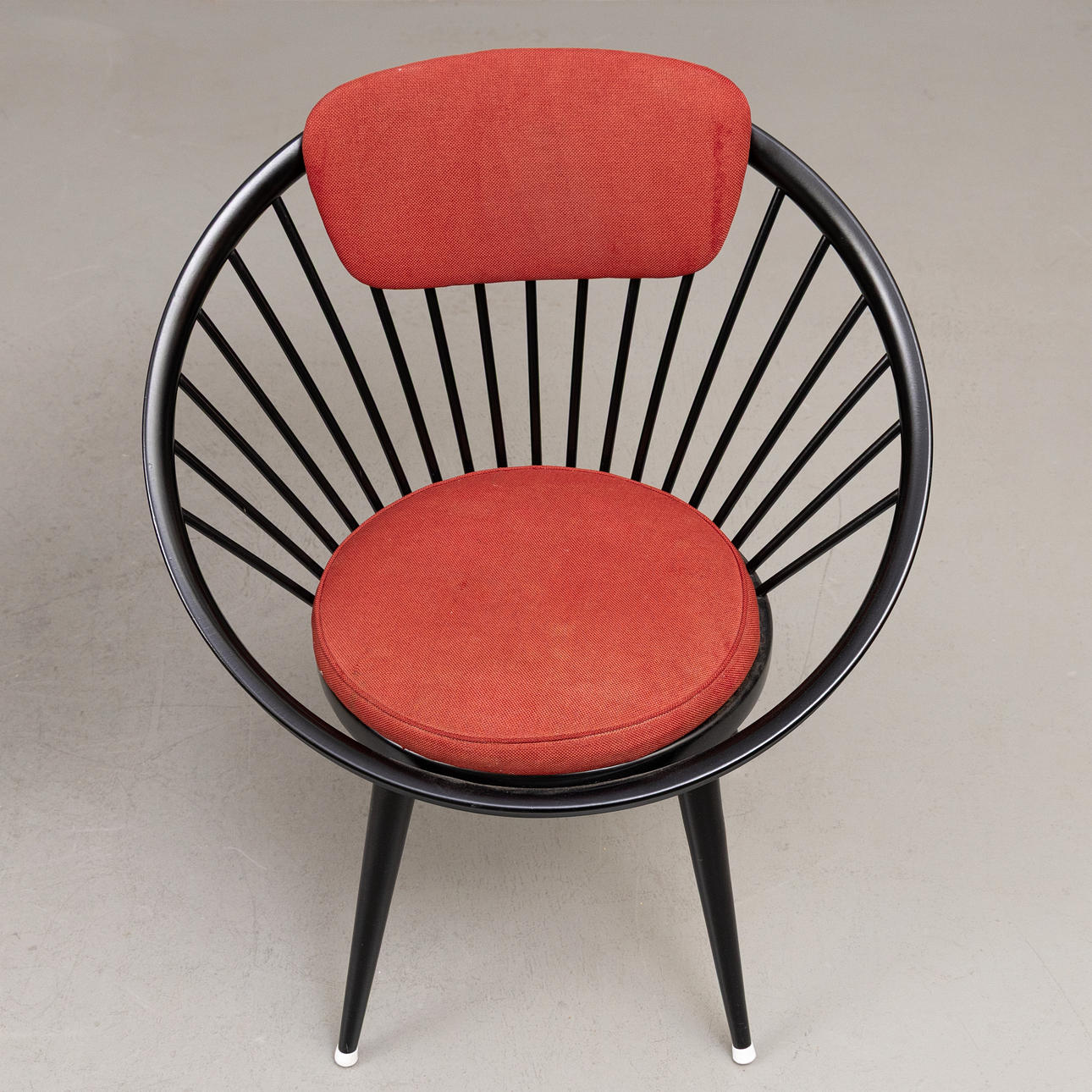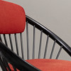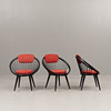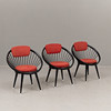 Tre fåtöljer med stomme i svartlackerat trä, stoppad textilklädd sits och ryggbricka. En stol etikettmärkt