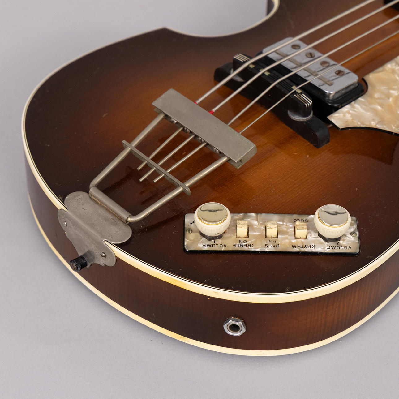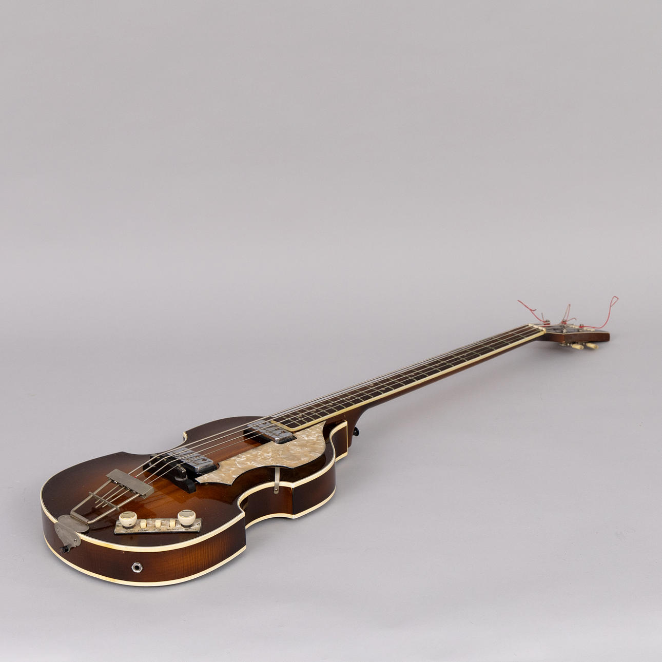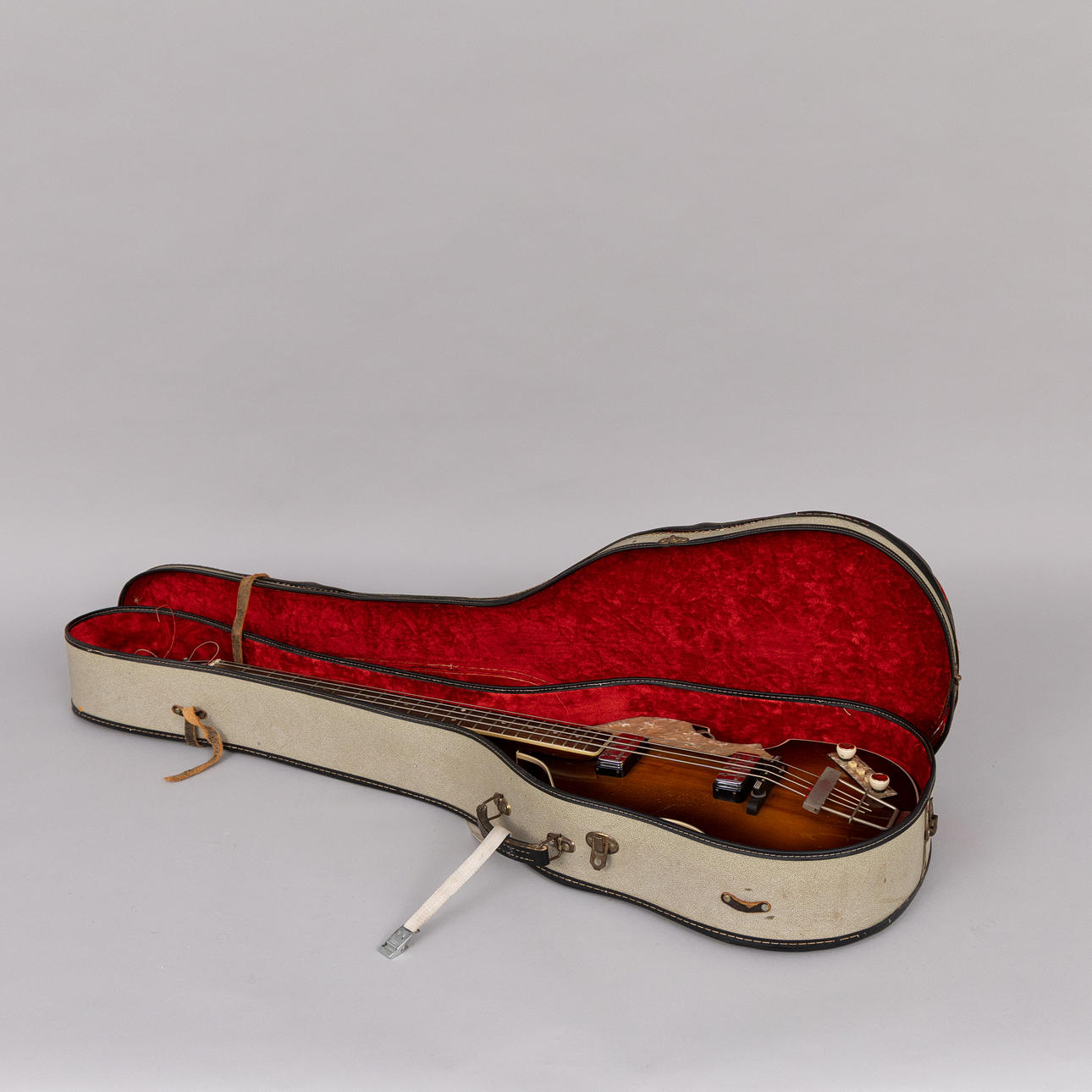 Höhner 500/1 basgitarr, tillverkningsår 1963/64, märkt 165 på huvud. Kommer i fodral från tiden.