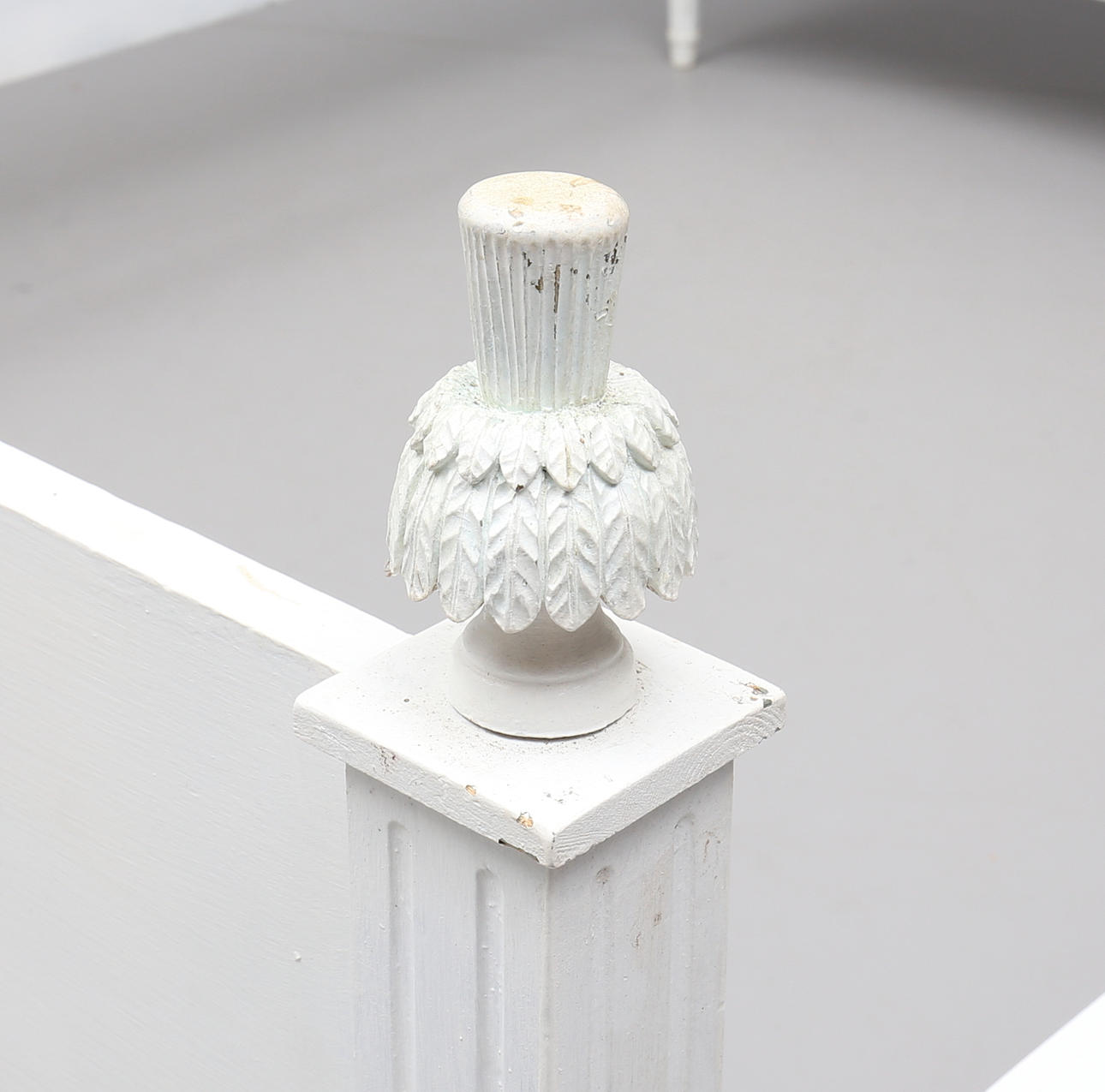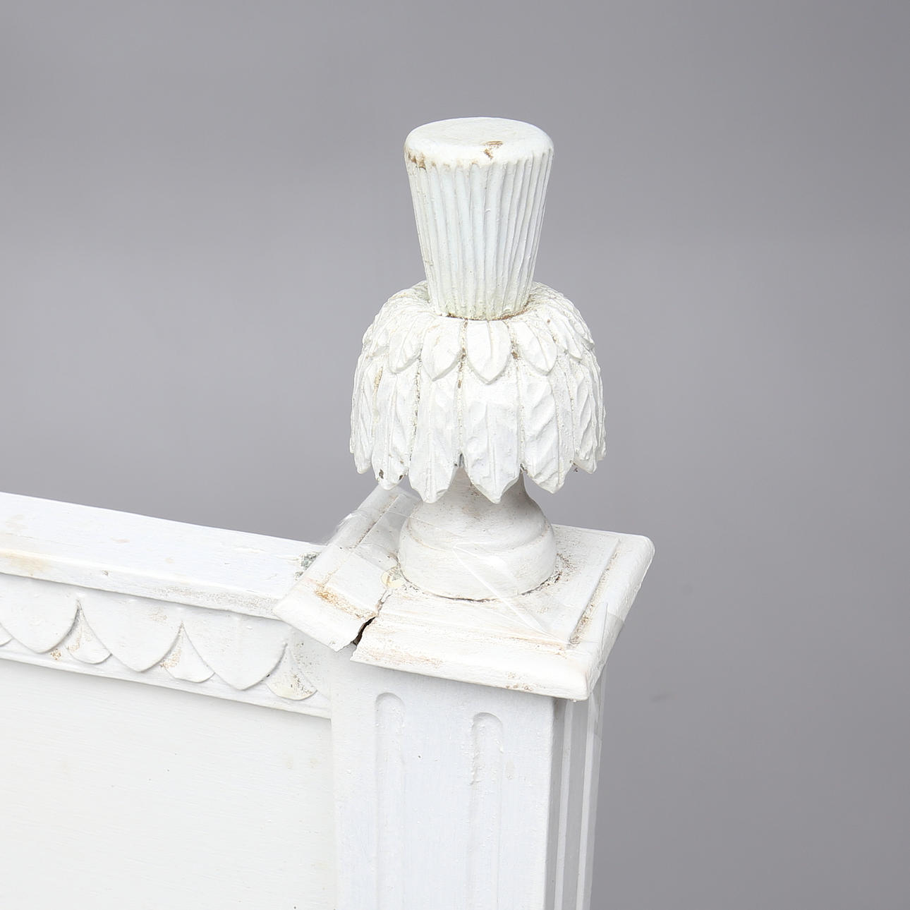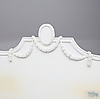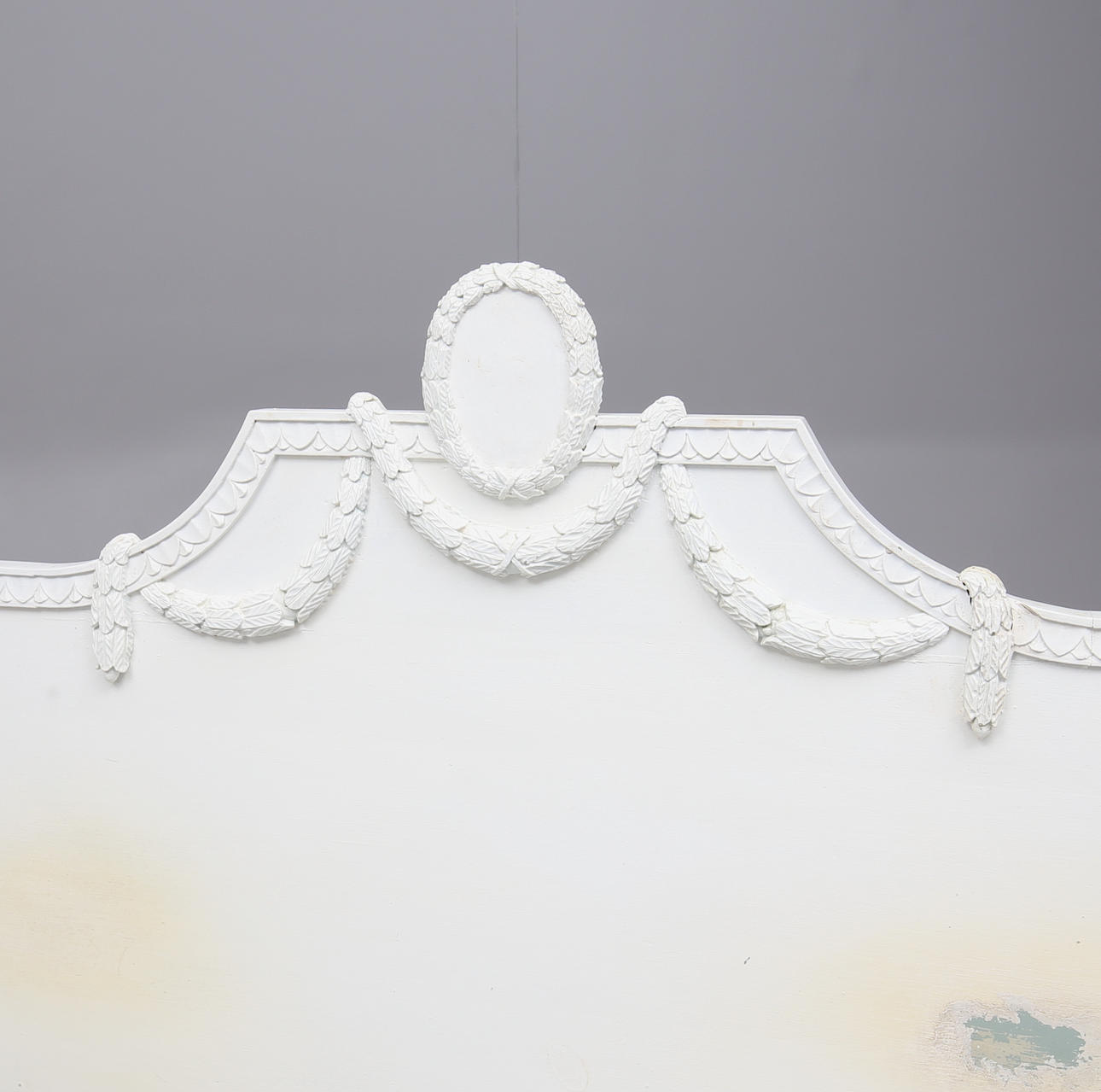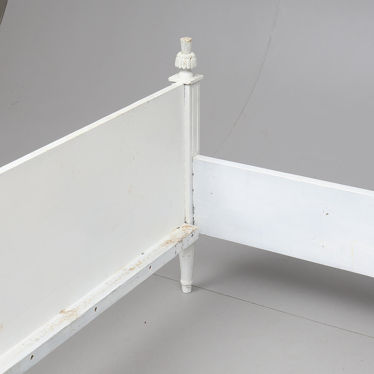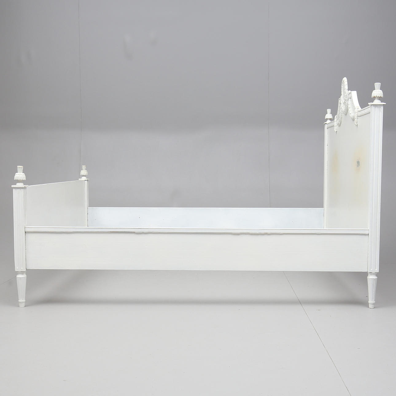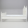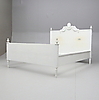 Dekor med bladskärningar, girland och kannelyr. Totalt 4 delar. Innermått ca 161 x 198 cm. Huvudgavelns totala längd 172 cm.