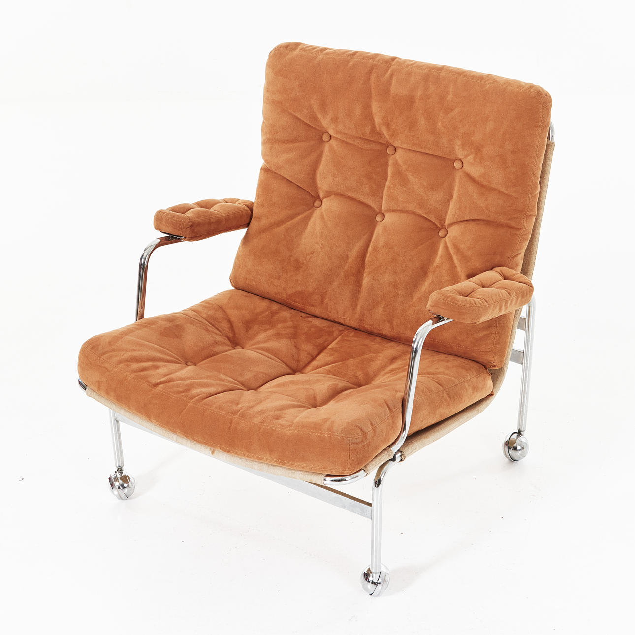Kromat underrede, klädsel i mockaimitation, sitthöjd ca 38, totalhöjd ca 84 cm.