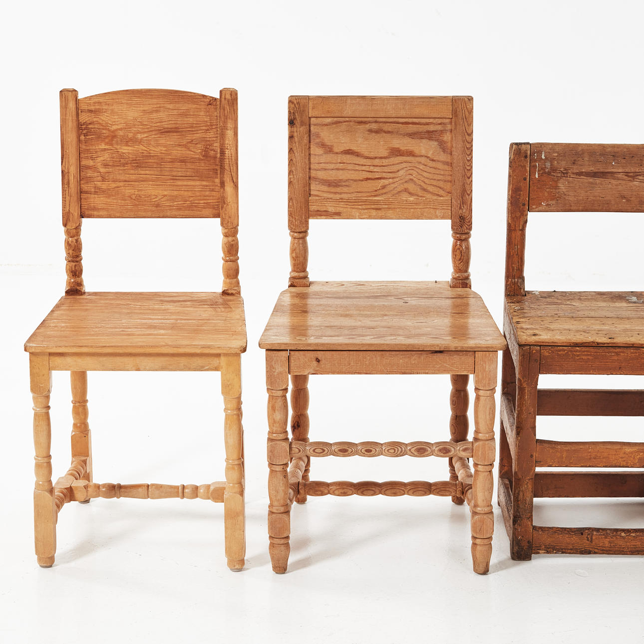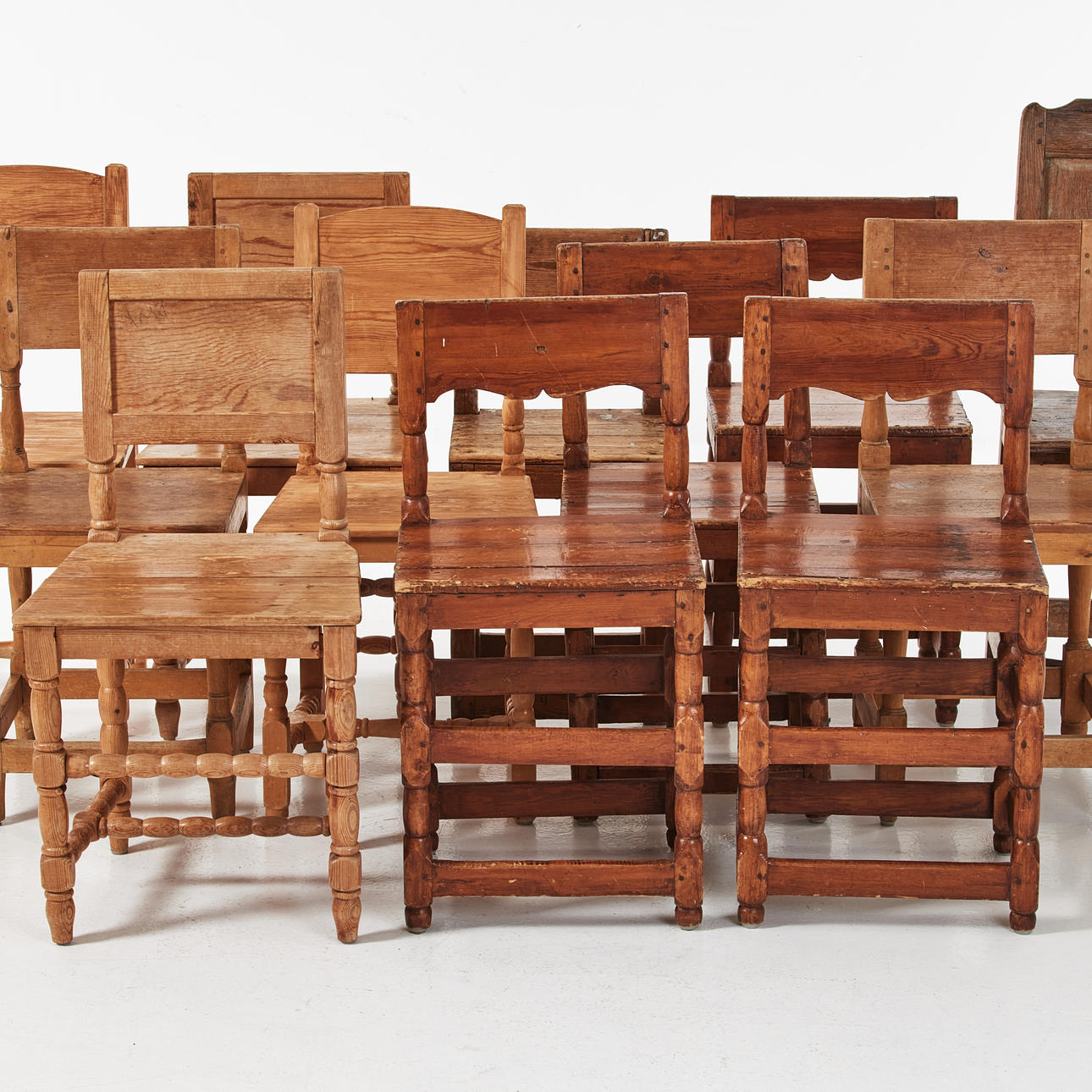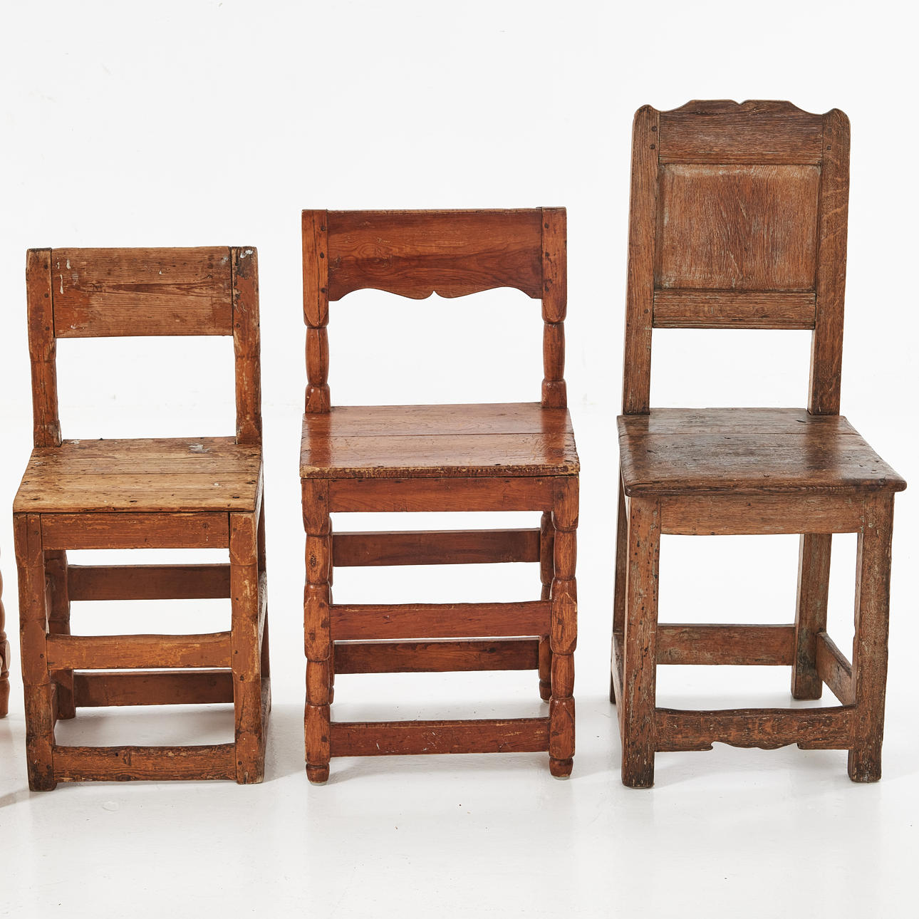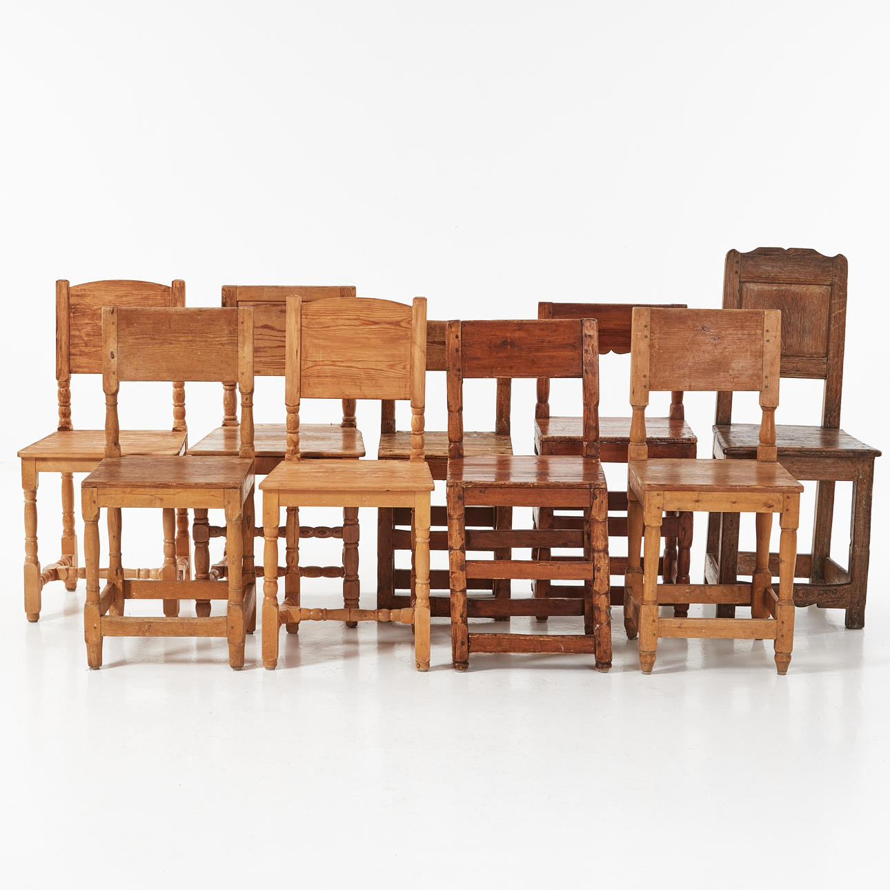 Av varierande typ och åldrar, bl.a. sk. tolvslåstolar. Sitthöjd ca 46-47 cm.