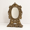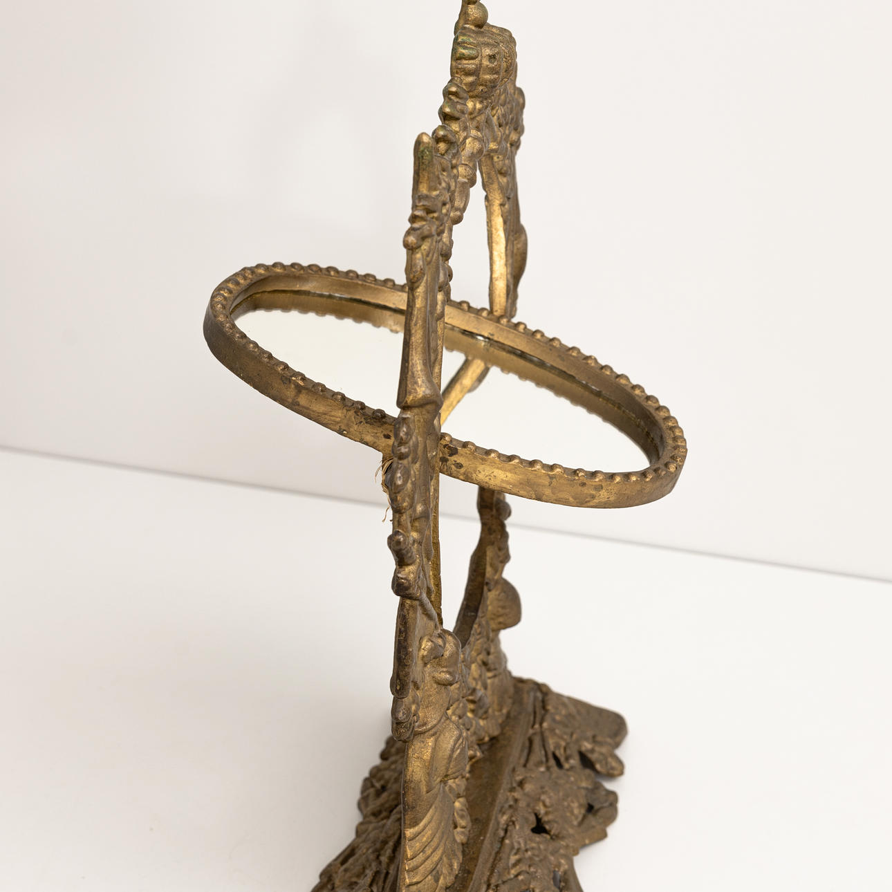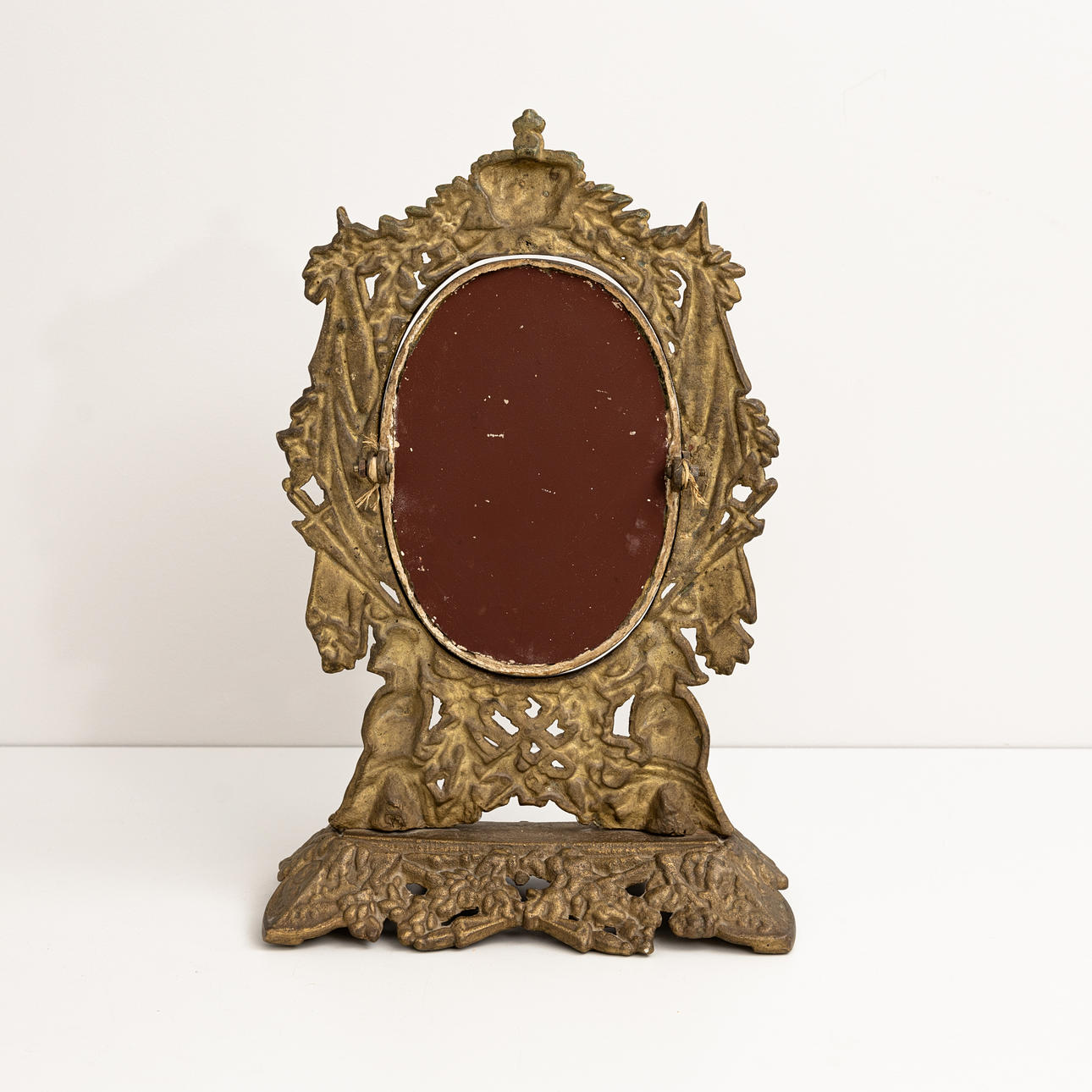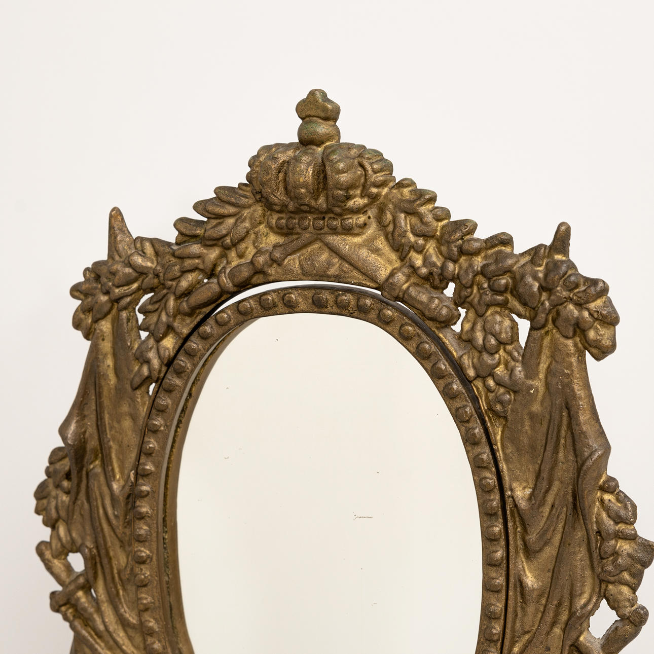 Spegeln i oval form, omgiven av rik dekor i form av krona, vapen och sköldar, bredd ca 32 och höjd 49,5 cm. Spegeln är vinklingsbar.