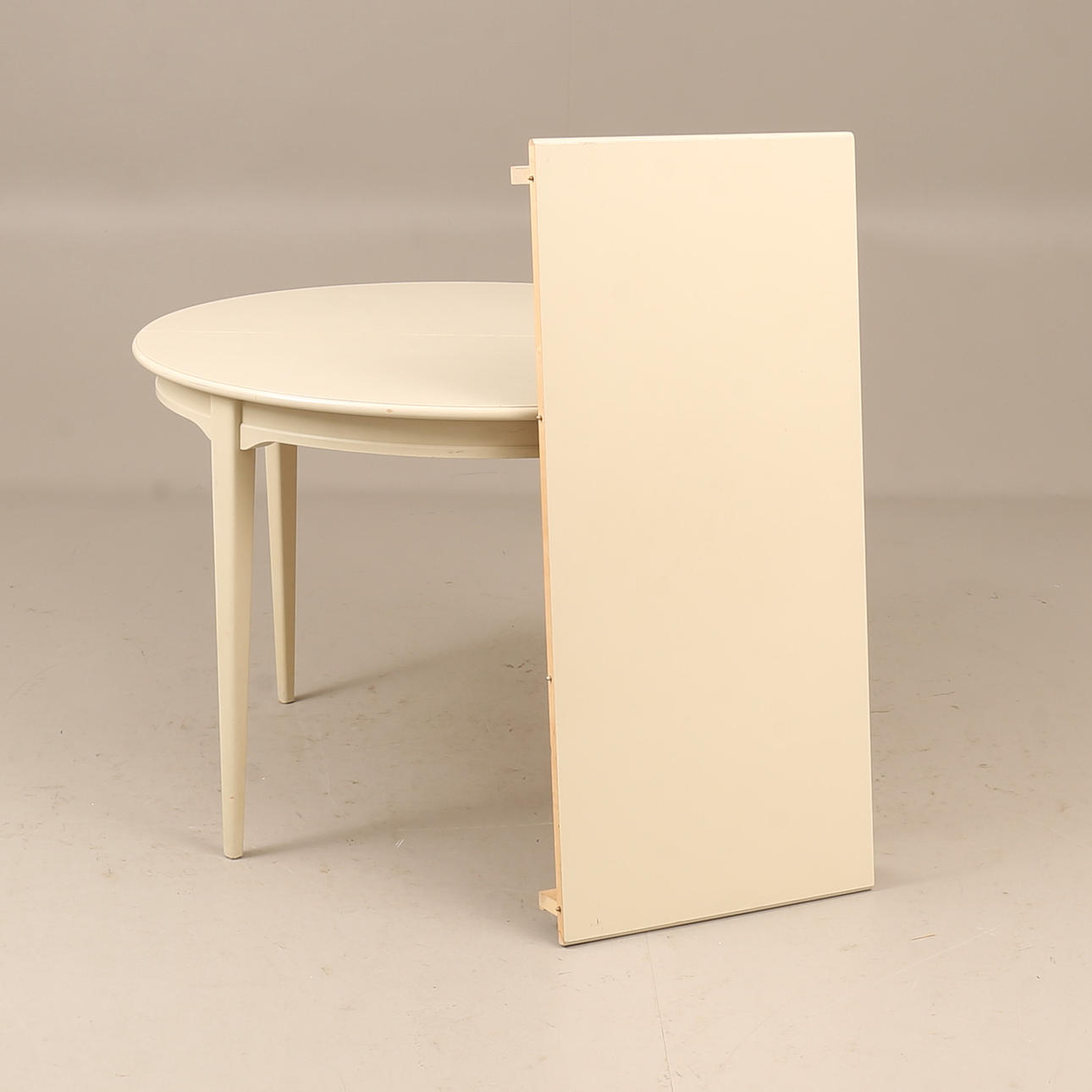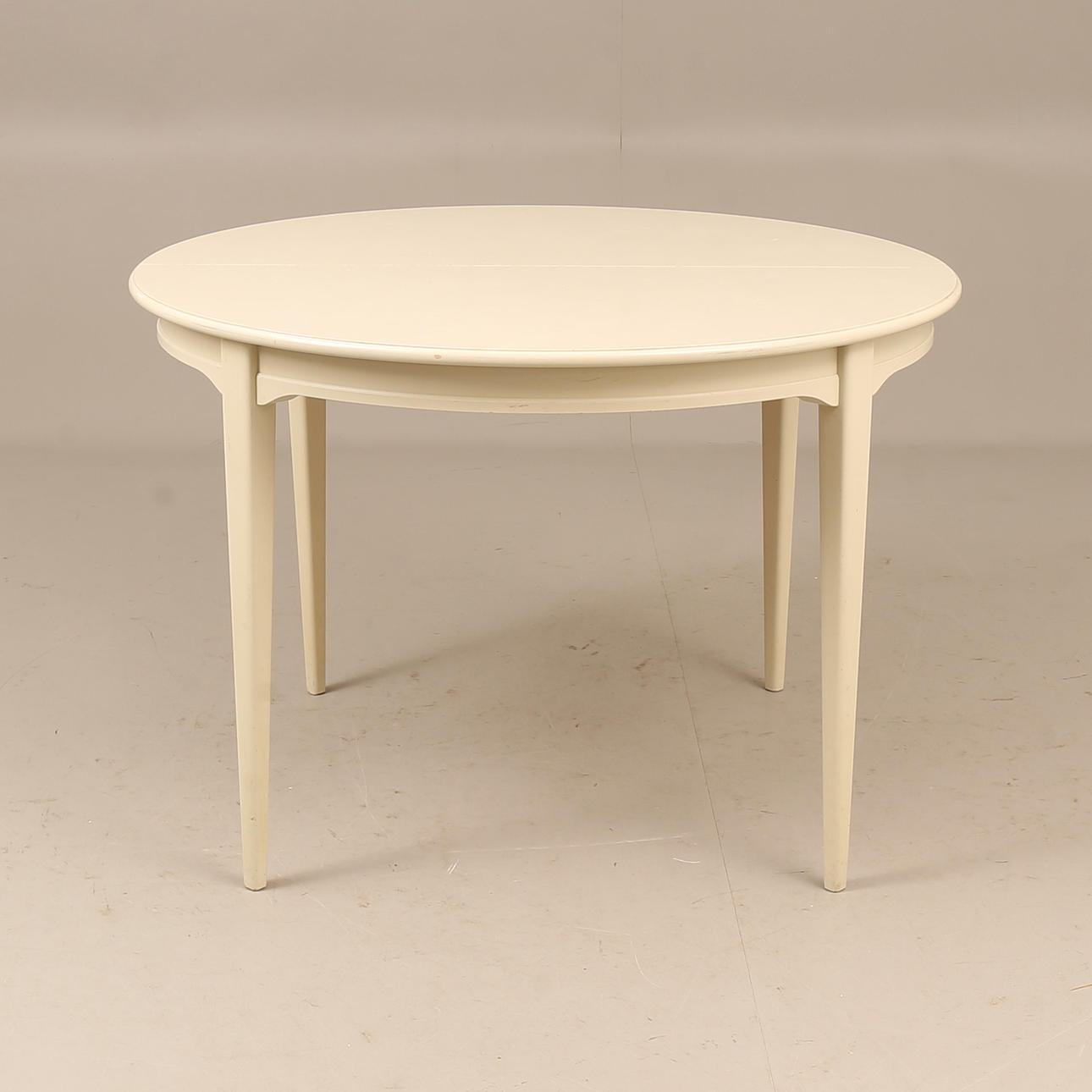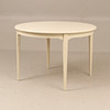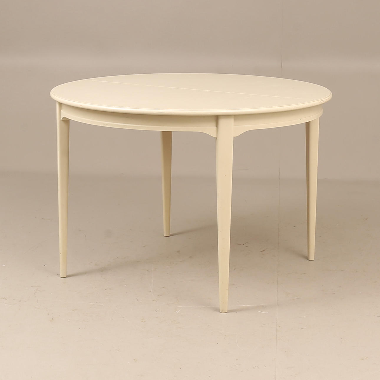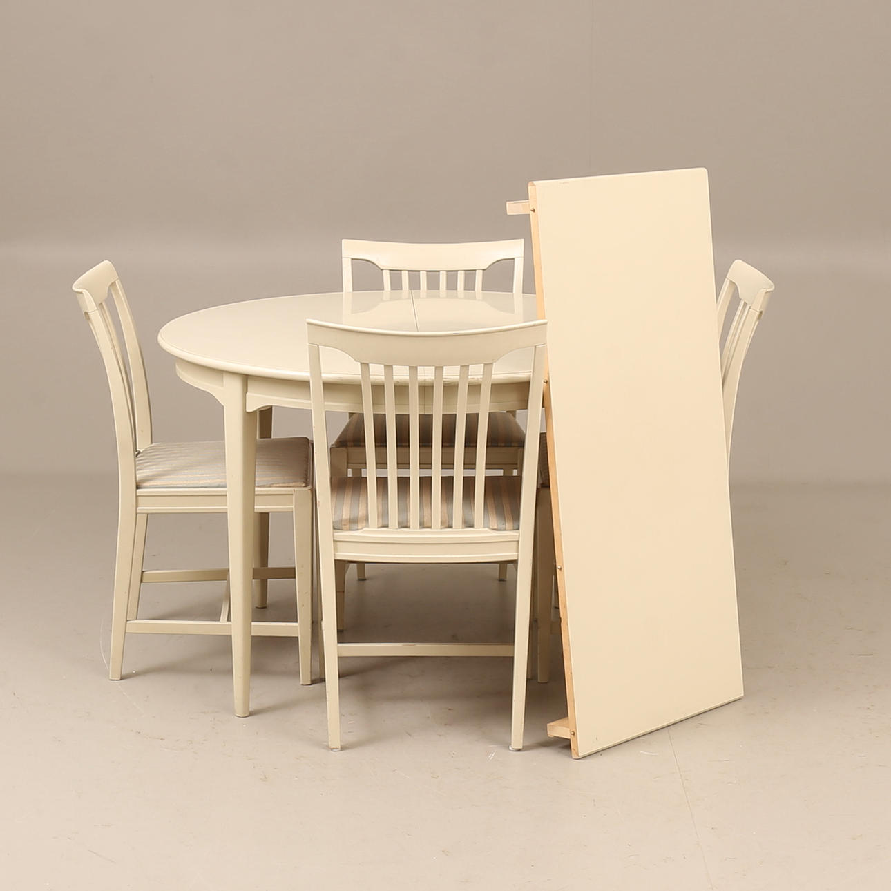 Bord diam ca 110 cm, höjd ca 74 cm, en iläggsskiva 50 cm, totallängd ca 160 cm. 4 stolar, sitthöjd ca 45 cm, höjd ca 85 cm.