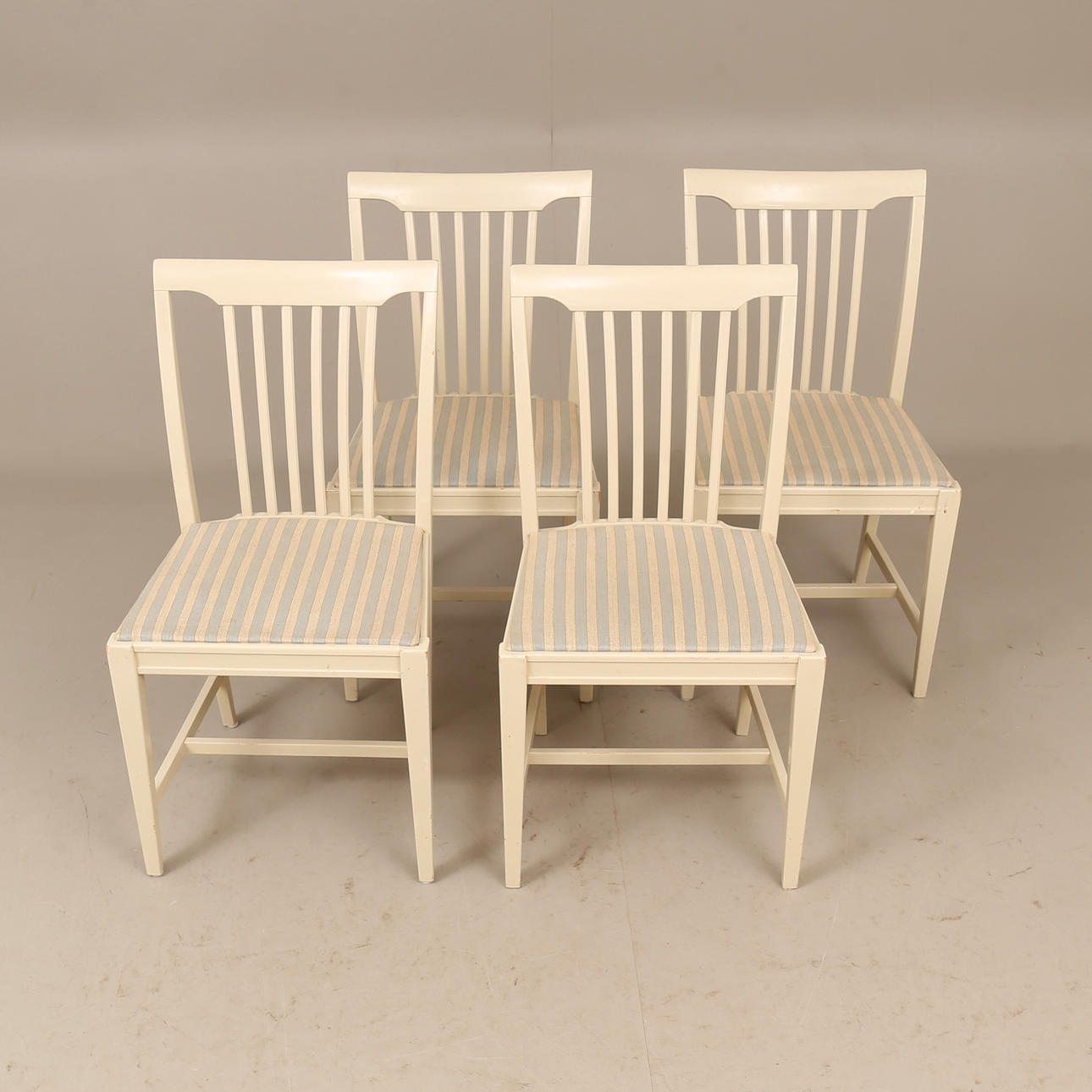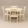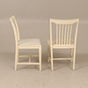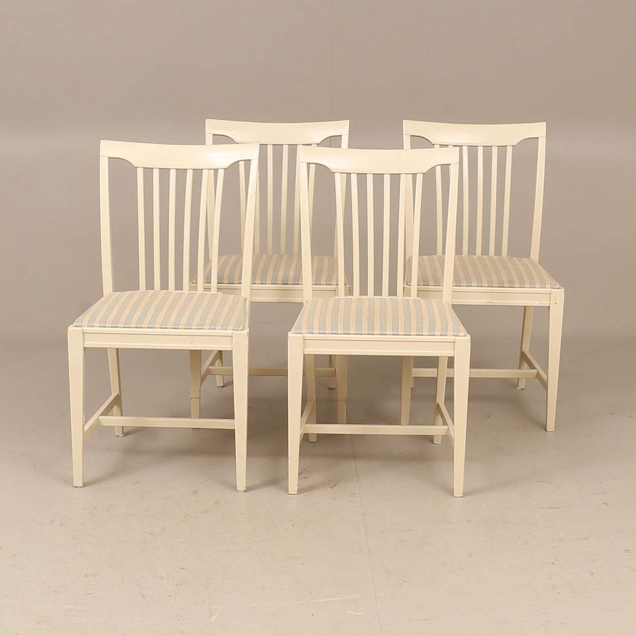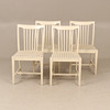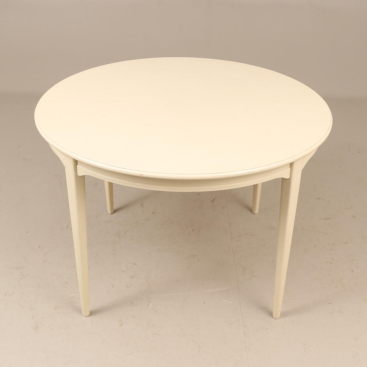 Bord diam ca 110 cm, höjd ca 74 cm, en iläggsskiva 50 cm, totallängd ca 160 cm. 4 stolar, sitthöjd ca 45 cm, höjd ca 85 cm.