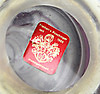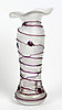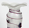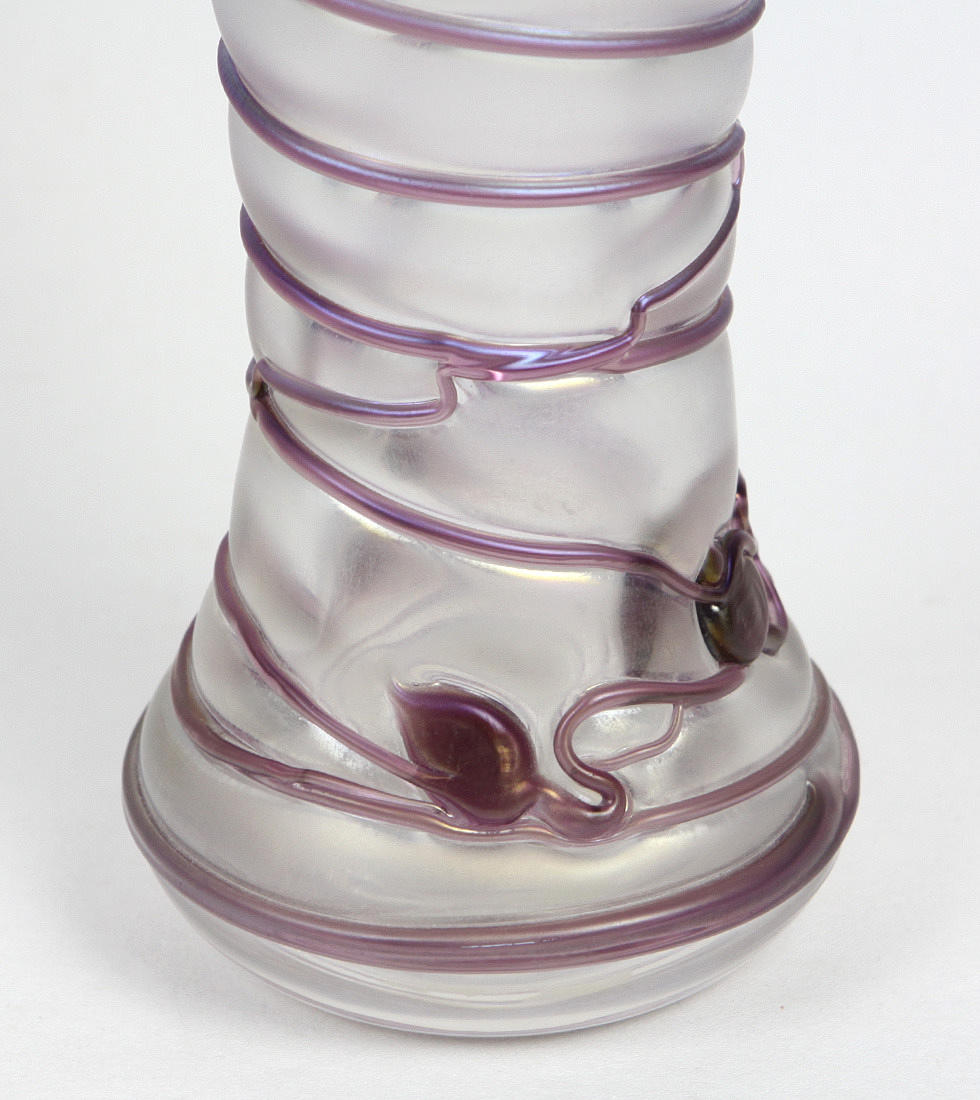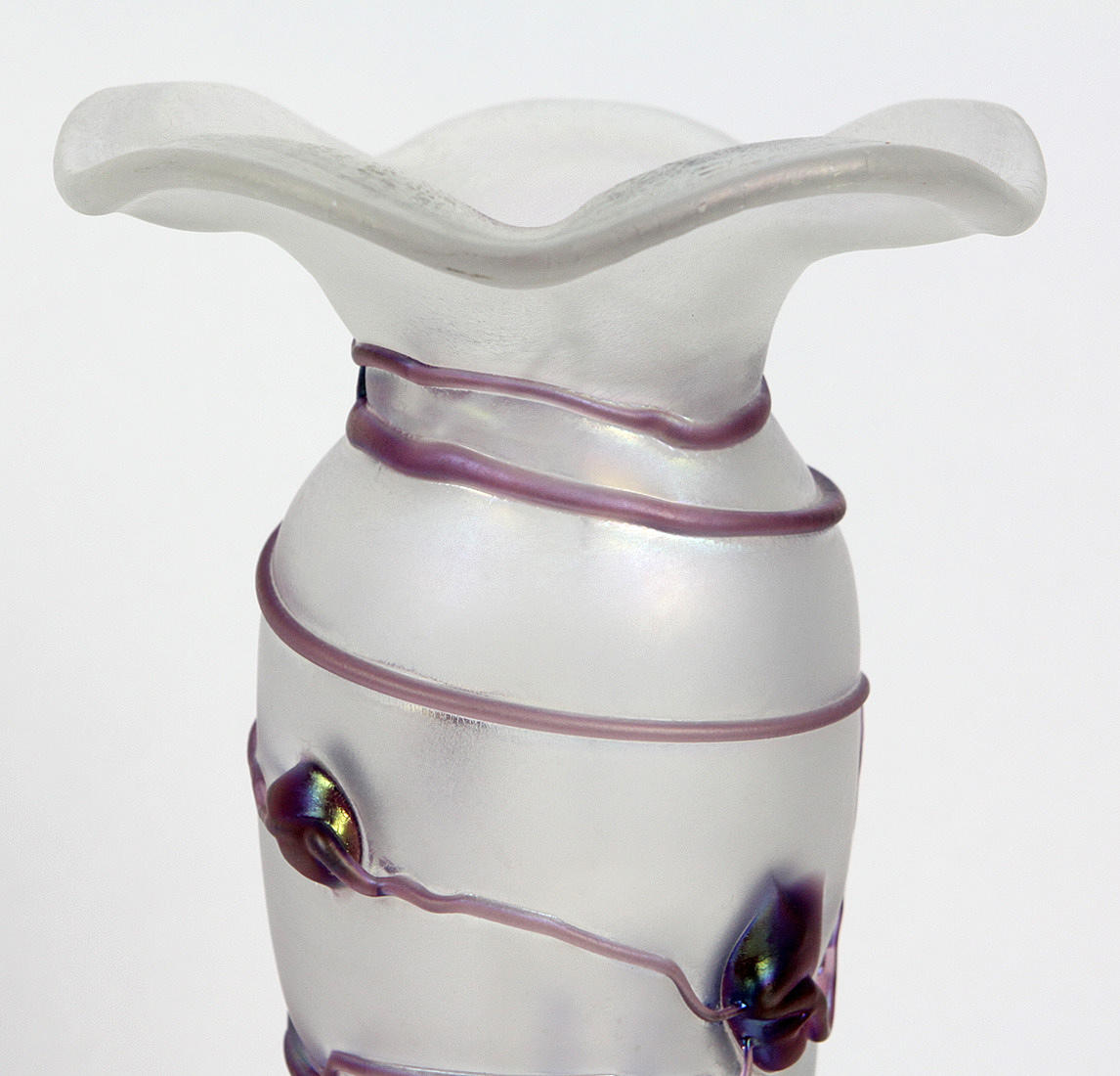 färglöst glas munblåst, sfärisk bas, frostat lätt iriserande yta med lila spiraltråd emalj, midja kropp med svängande vågig kant, höjd ca.. 26 cm, etikett Freiherr von Poschinger munblåst sedan 1605.
