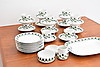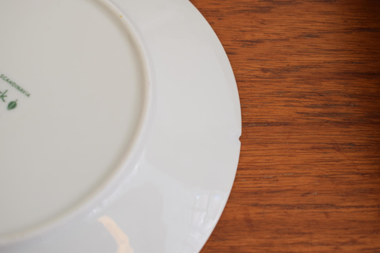 Det stora fatet har ett litet chip i det och en av desserttallrikarna har ett litet chip