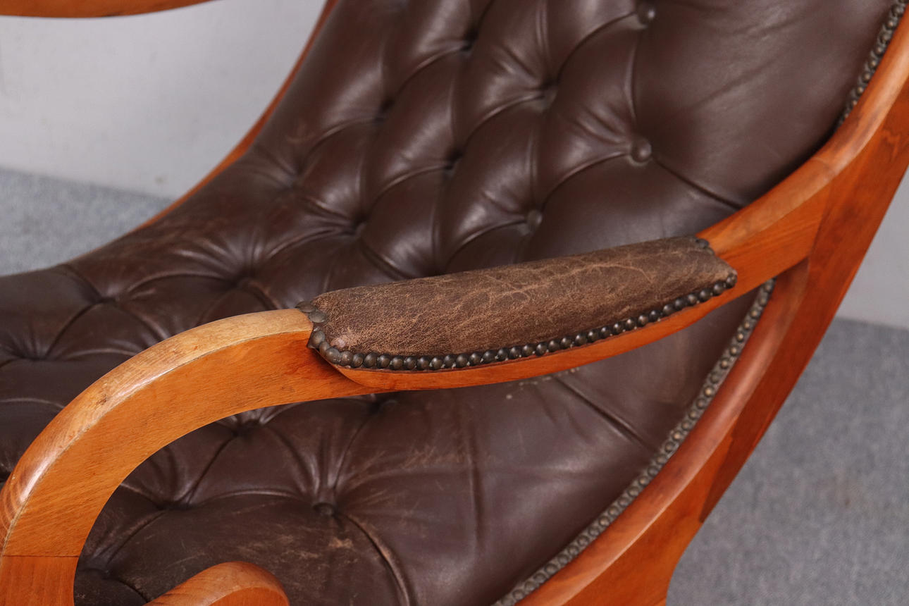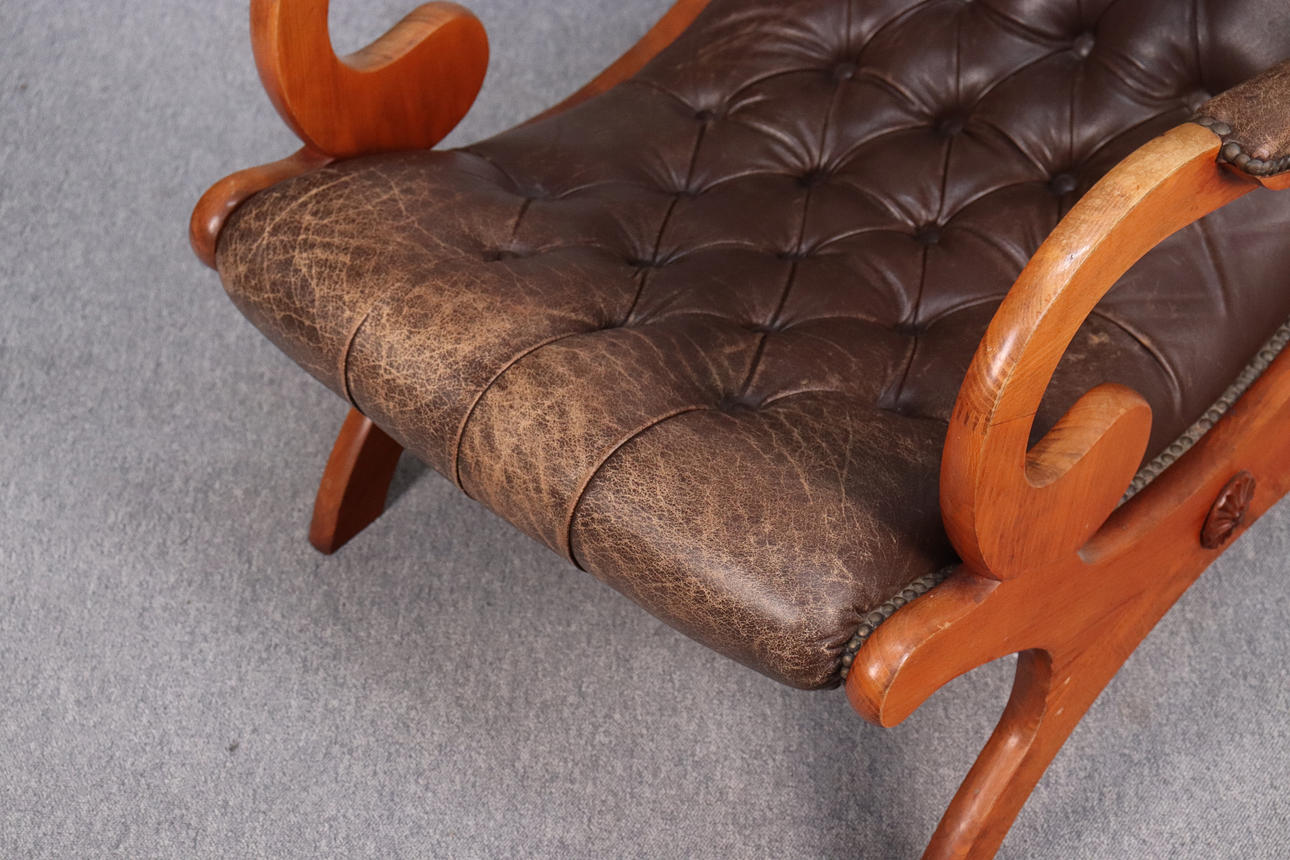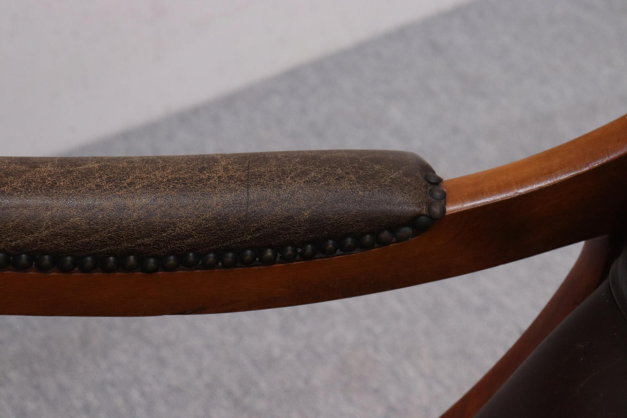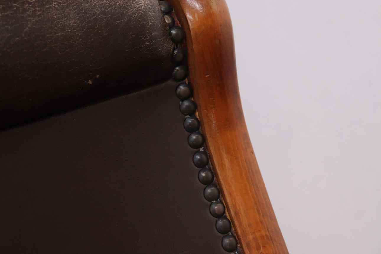 Läderklädd med trästomme. Höjd 93cm, sitthöjd ca 32cm.