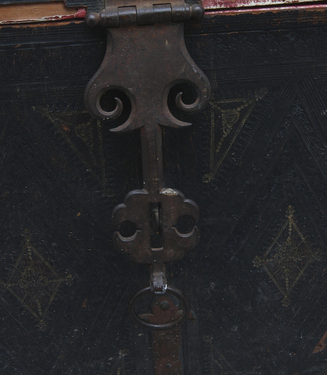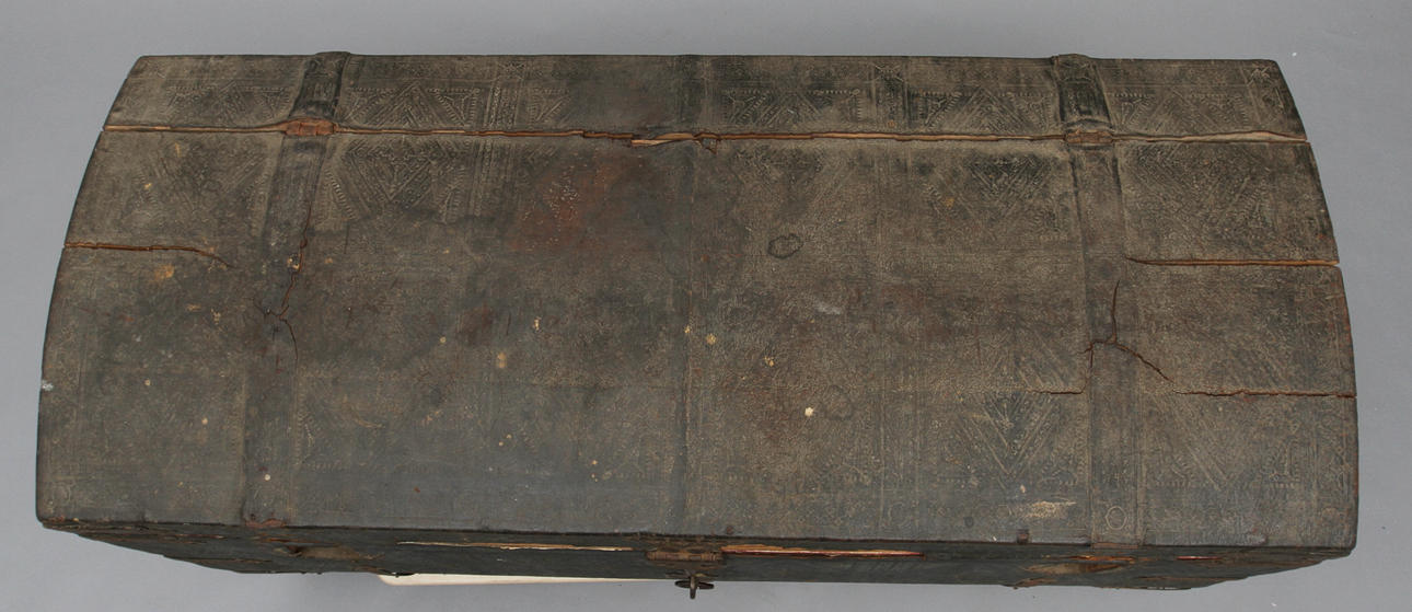 Beklädd med präglat läder med dekor av orientaliskt mönster. Längd 152 cm.