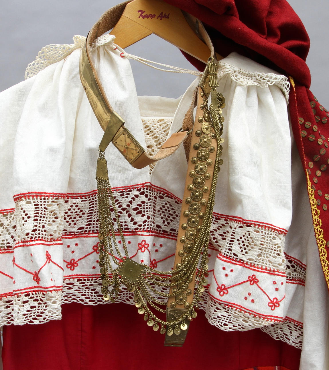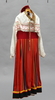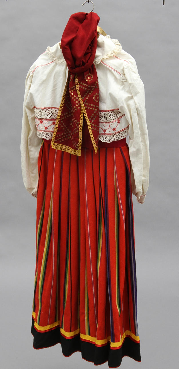 Dräkt bestående av blus, klänning, förkläde, mössa samt bälte.