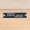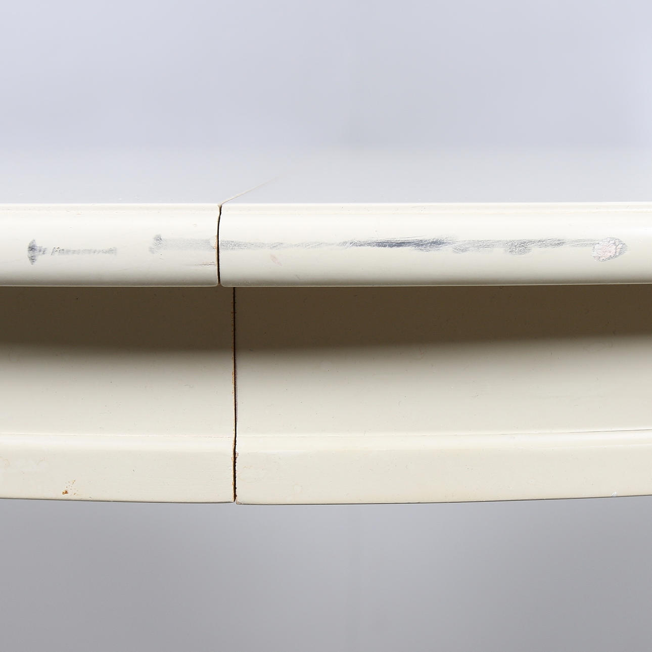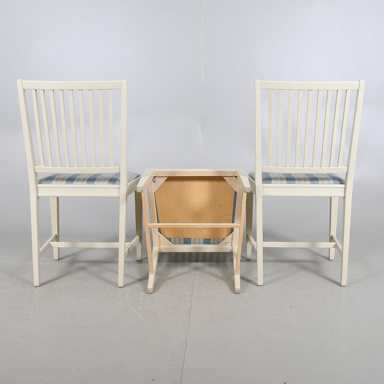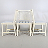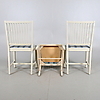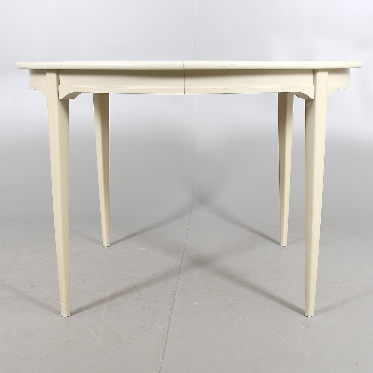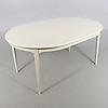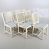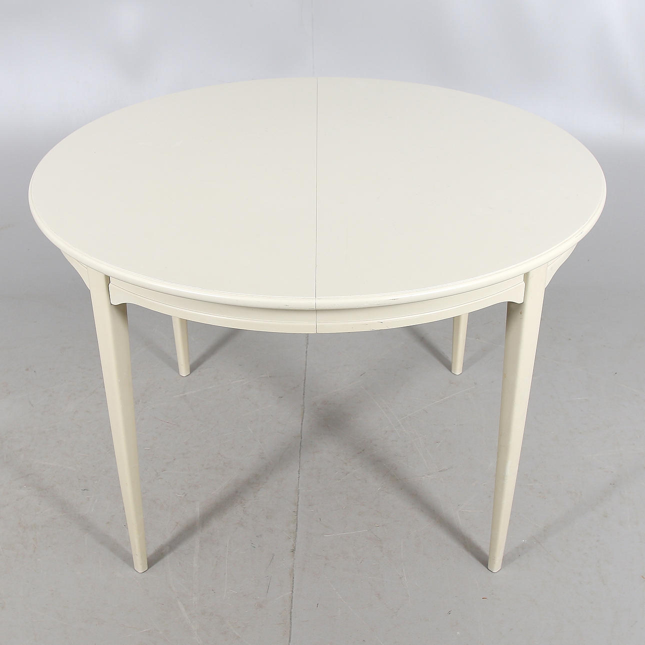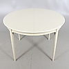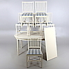 6 stolar. Bord i rund form, diameter 110, höjd 70 cm. Iläggsskivor, 2 x 50 cm.