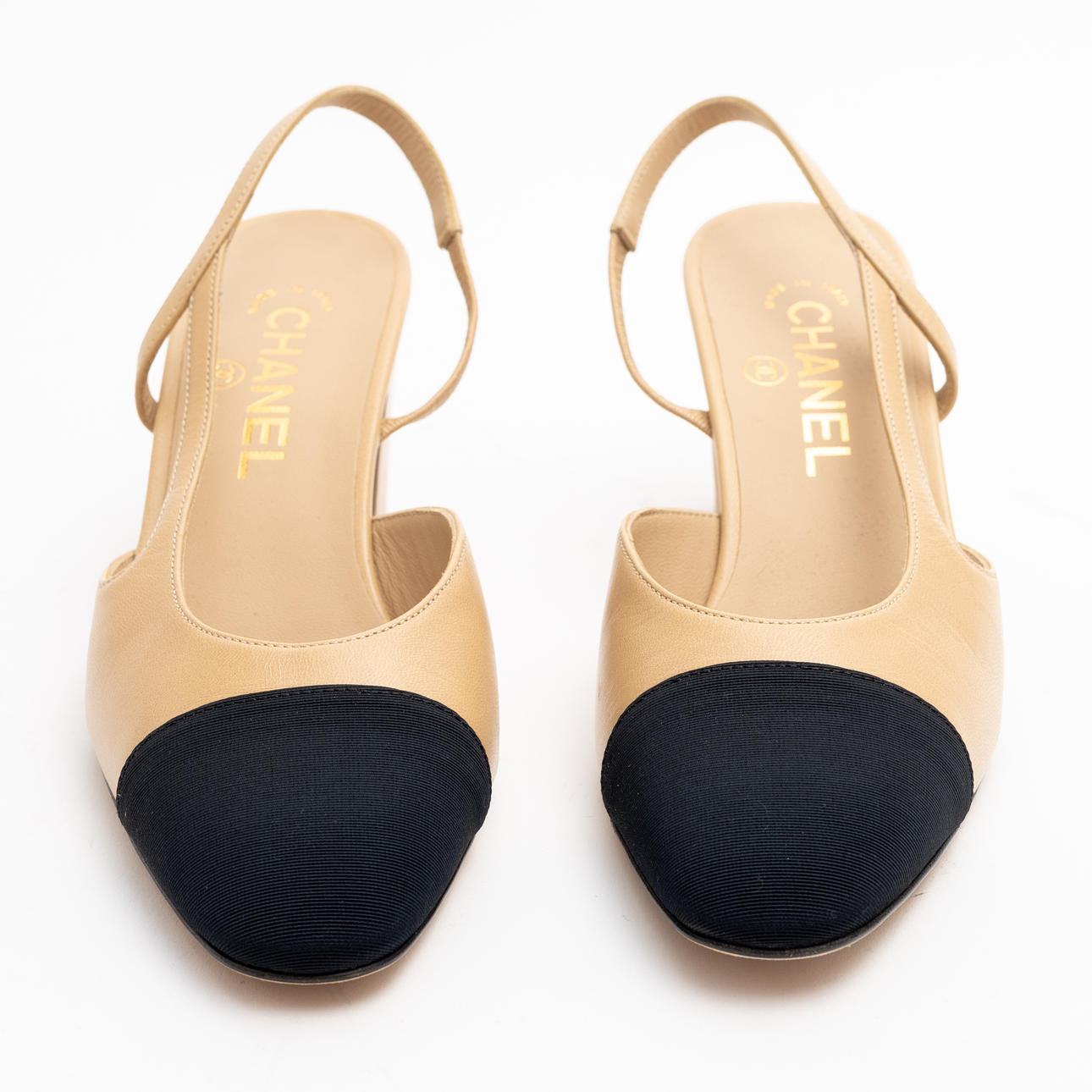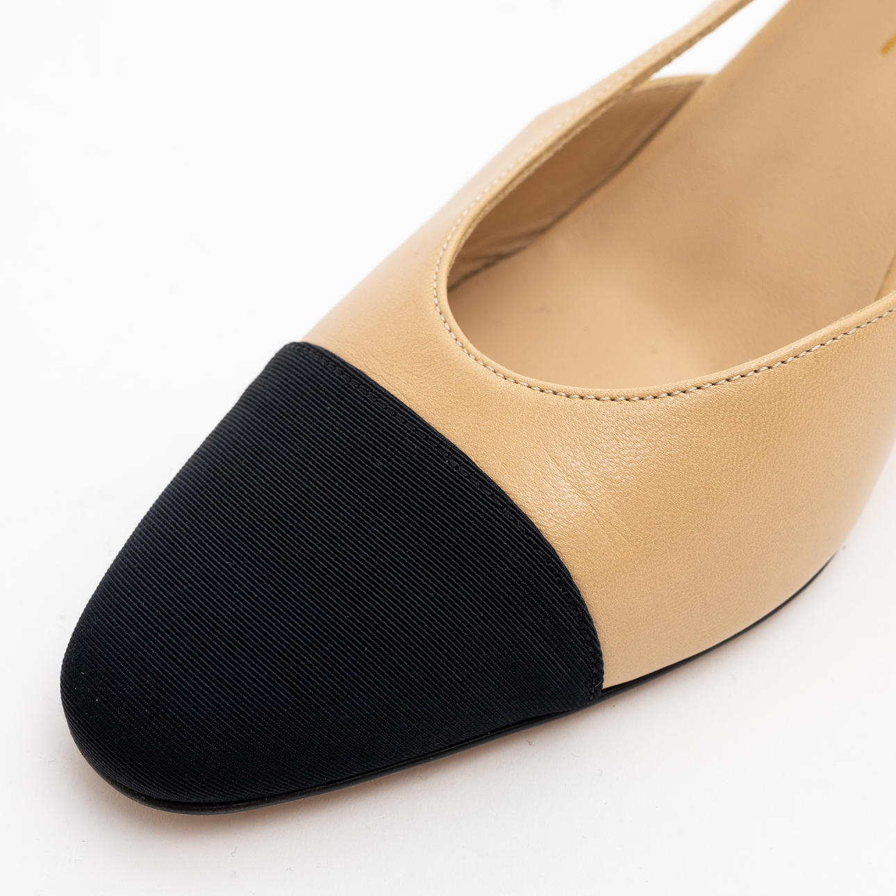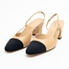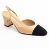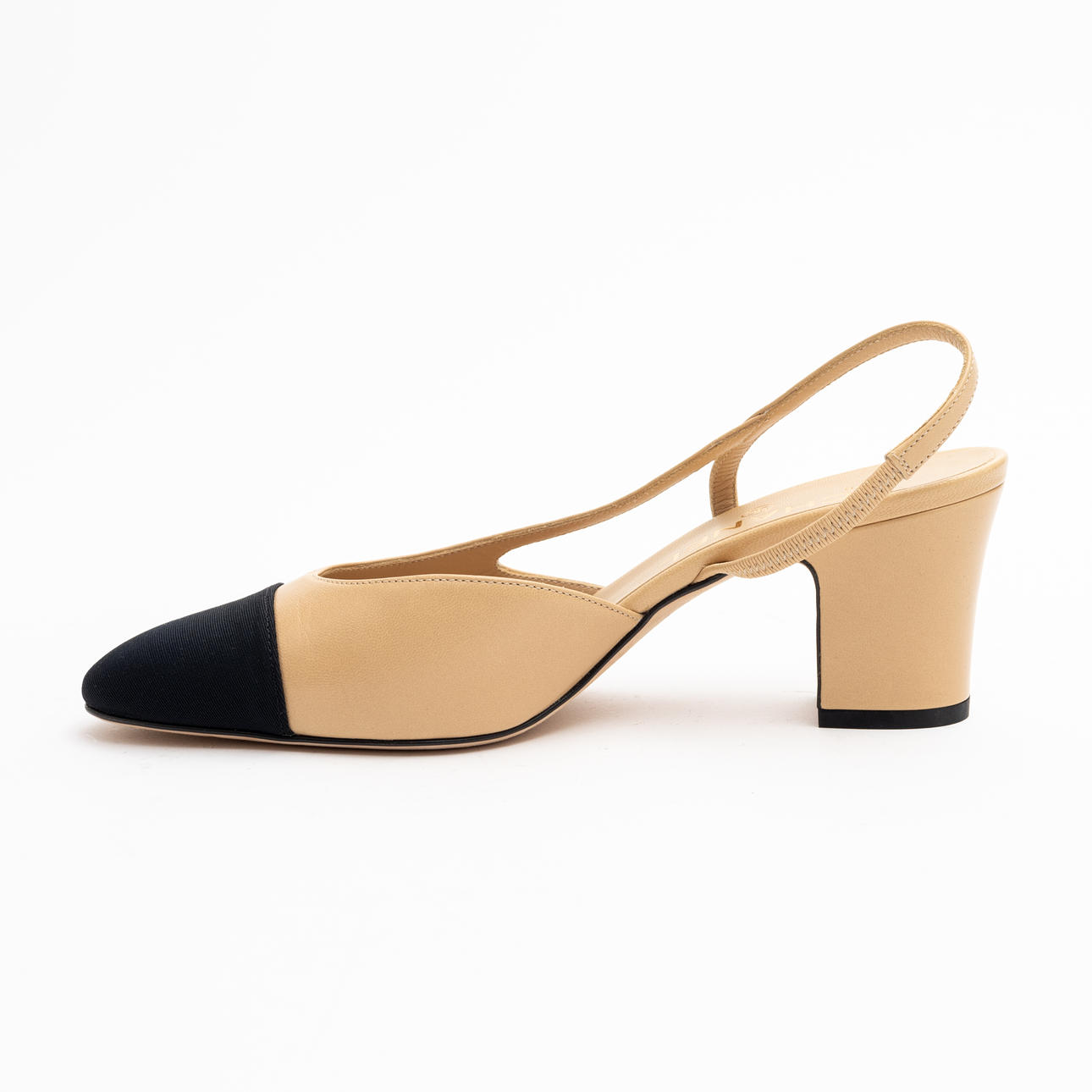 Beige lammskinn med svart ripstyg på tå. Klackhöjd 7 cmm snl märkning storlek 38C, Märkta "CHANEL MADE IN ITALY" på innesula samt med dubbla CC-loggan i guld på klack