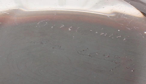 Bruksslitage. Kanna, gulmetall med lagning och bucklor.