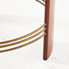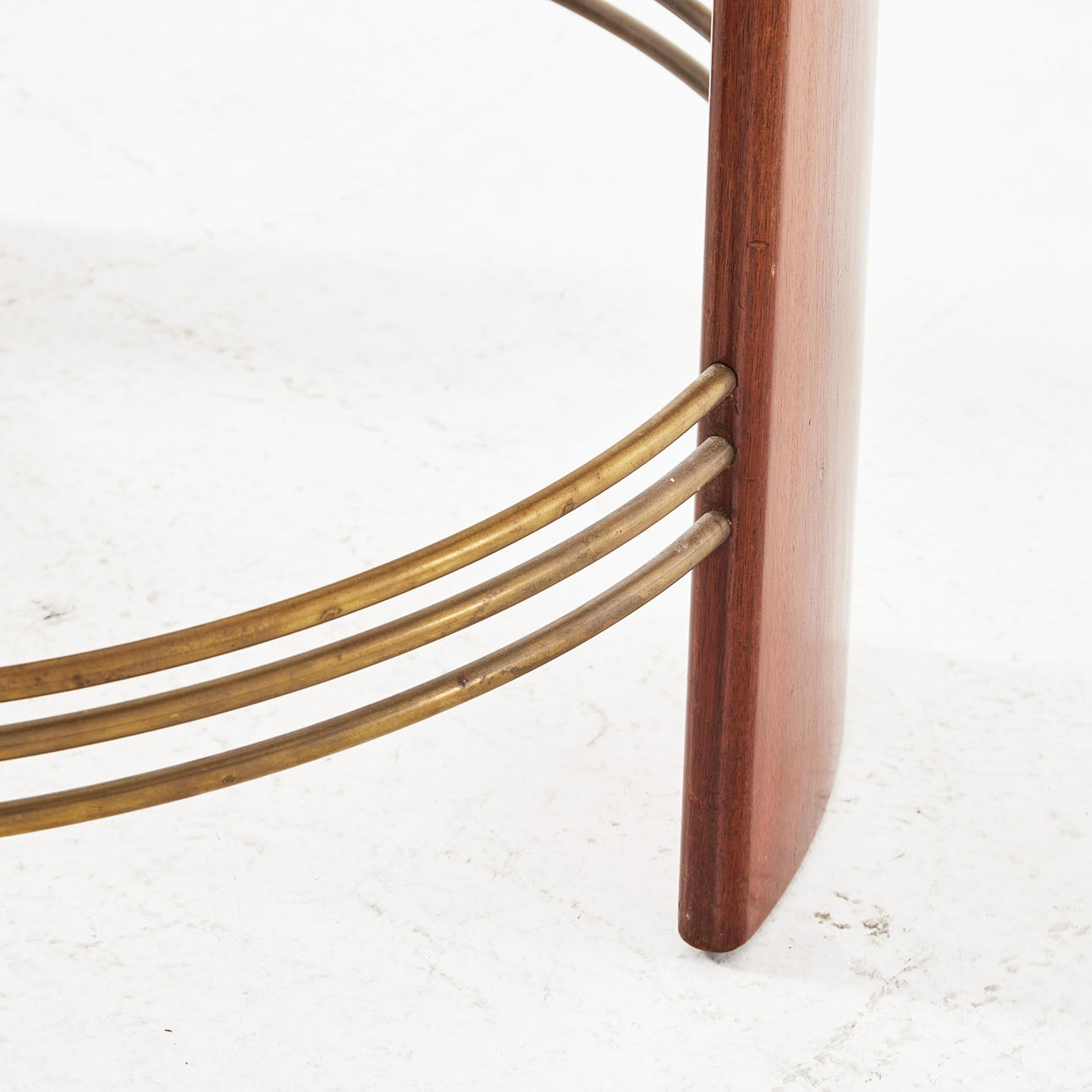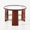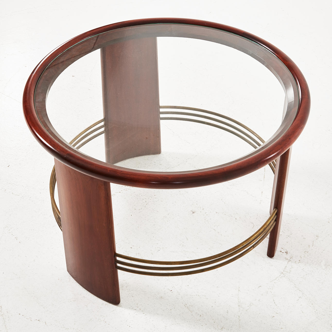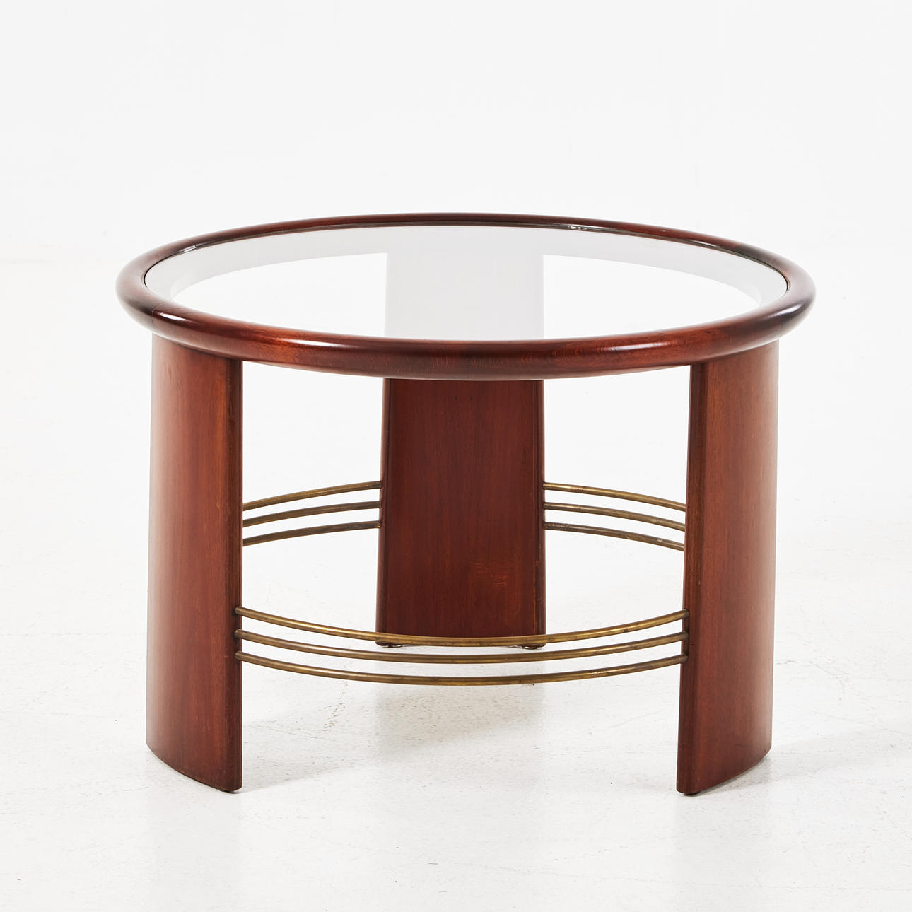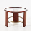 Mahogny, skiva i glas, benen med kopplade mässingsrör, höjd ca 52, diameter 72 cm.