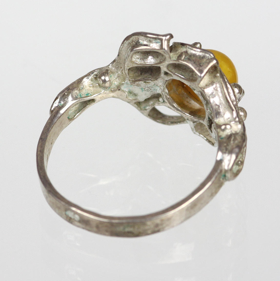 blommig genombrutna ringhuvud i organisk form, med bärnsten cabochon på ca.. 7,3 mm diameter, ringstorlek 57/58, vikt ca. 4 gram.
