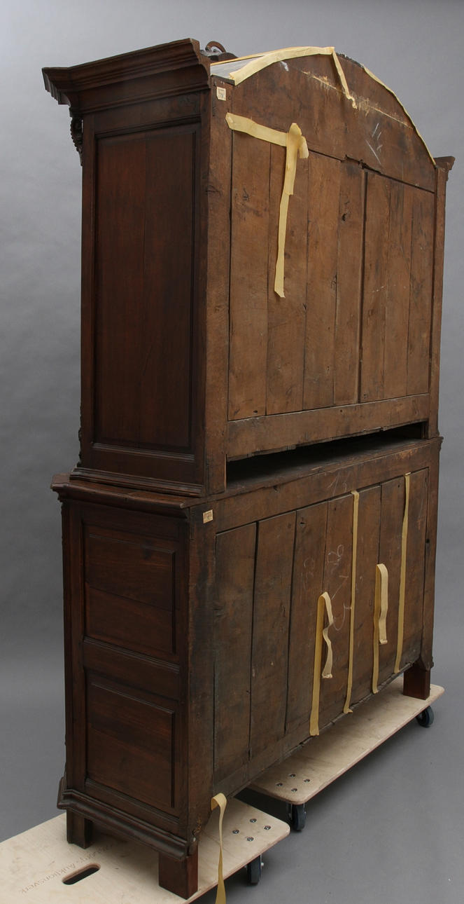 Ek. Dekor av voluter och växter. Två dörrpar varav ett i glas samt lådor. Längd 166, bredd 58, höjd 260 cm.