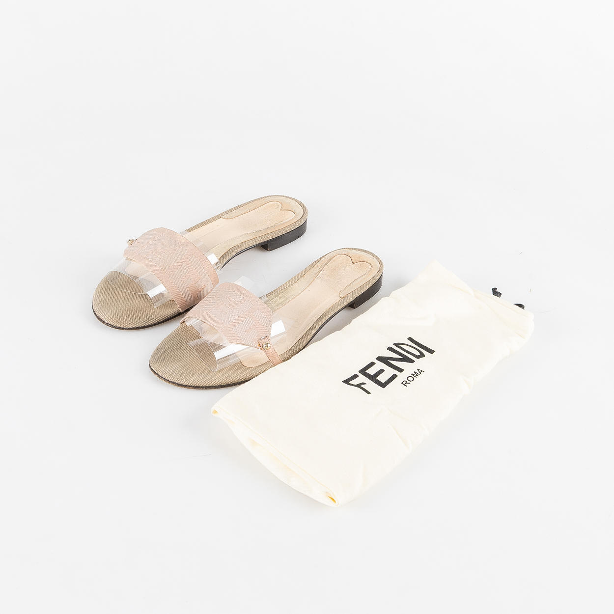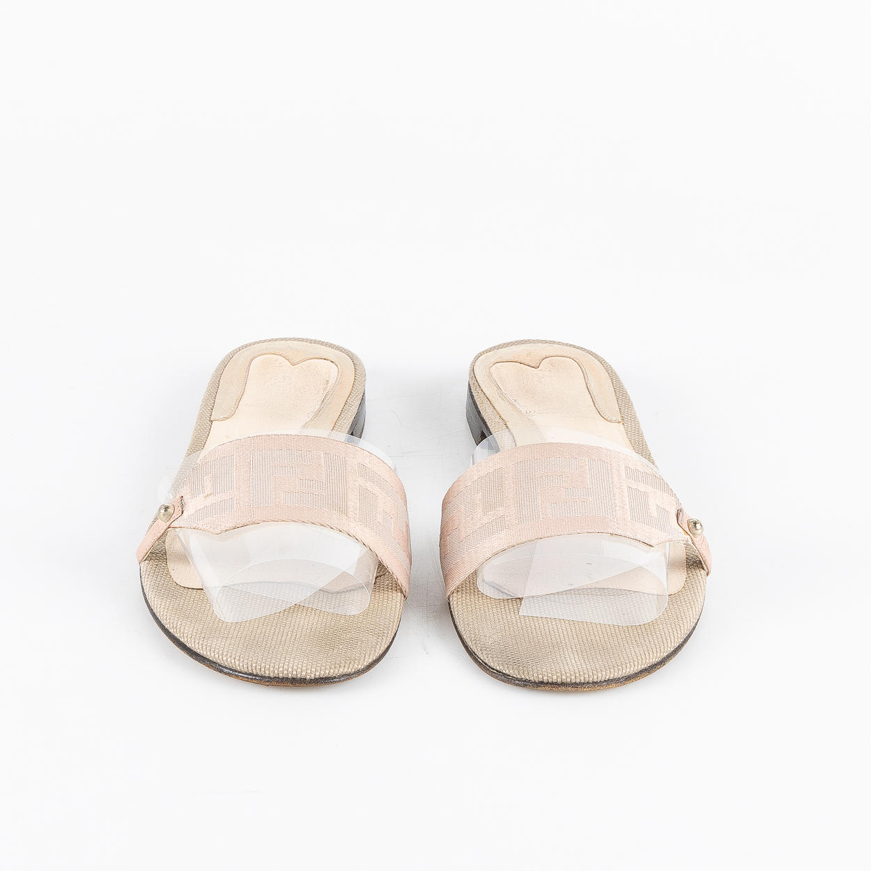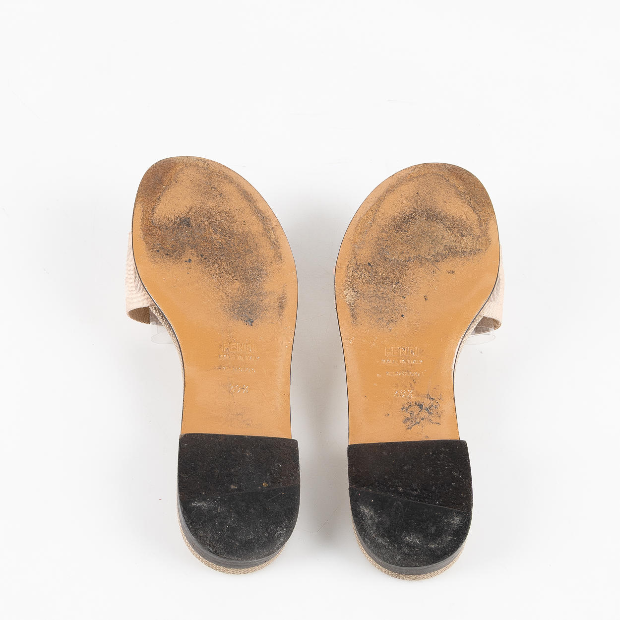 Sandaler / slip in med Fendi F- vävda band i beiget. Sula i läder. Märkta Fendi made in italy, 39,5. Skopåse medföljer. Innermått ca 25 cm.