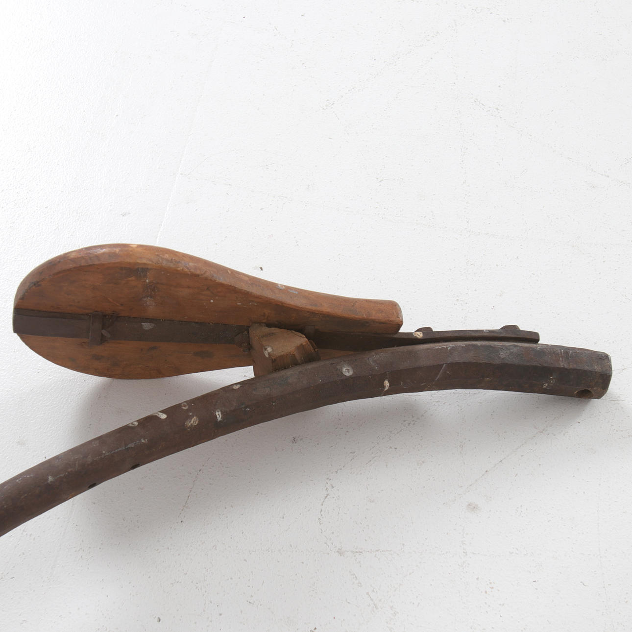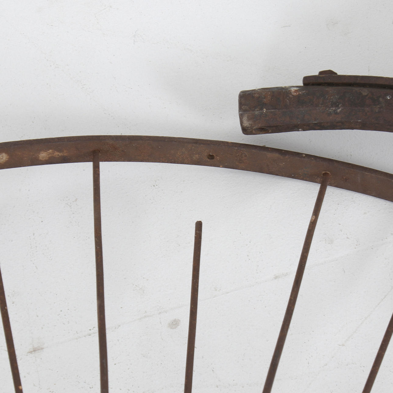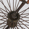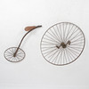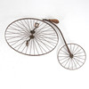 Framhjul och bakhjul samt ram med sadel i trä. Diameter framhjul ca. 117 cm, diameter bakhjul ca. 58,5 cm, längd ram ca. 121 cm.