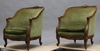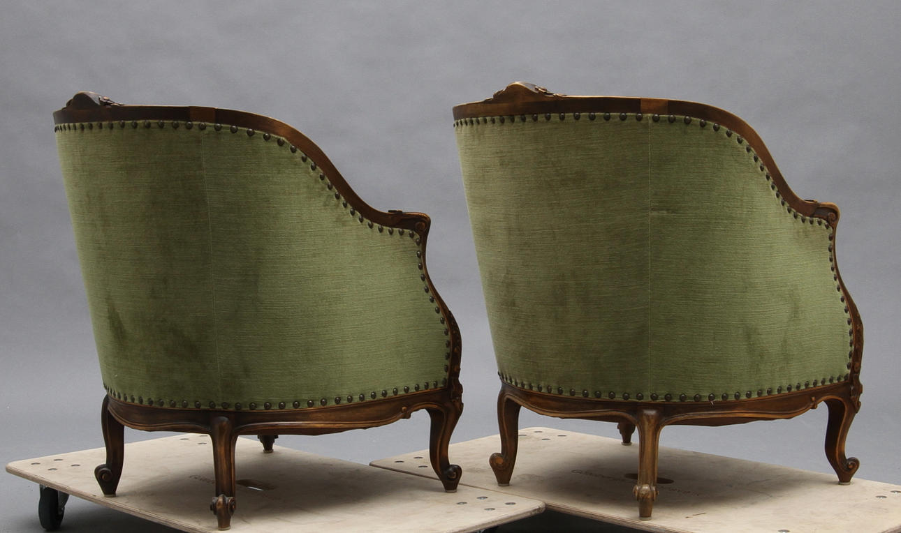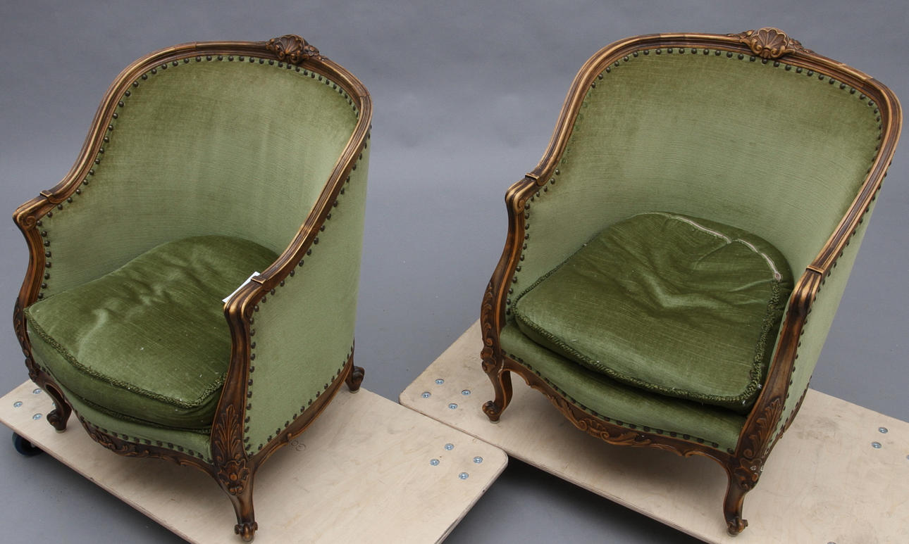 Valnöt. Skuren dekor. Klädda i grön plysch.