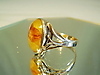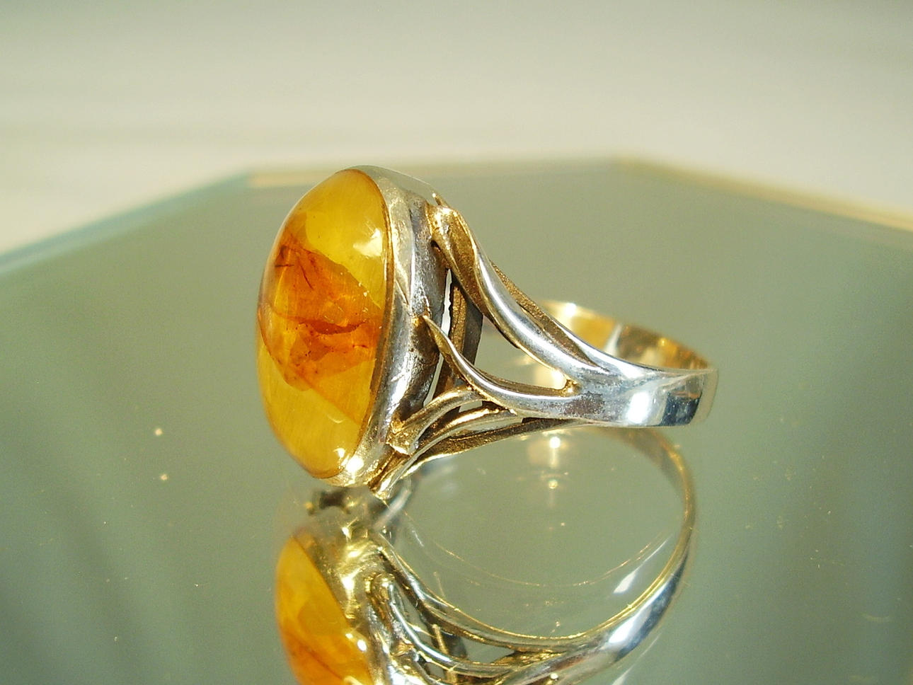 Ringhuvudet är inställt med en oval bärnsten cabochon i transparent honungsfärg med en intressant inkluderingsbild. Den polerade bärnstenen är omgiven av en slät ram, ringaxlarna har en öppen blommig struktur.