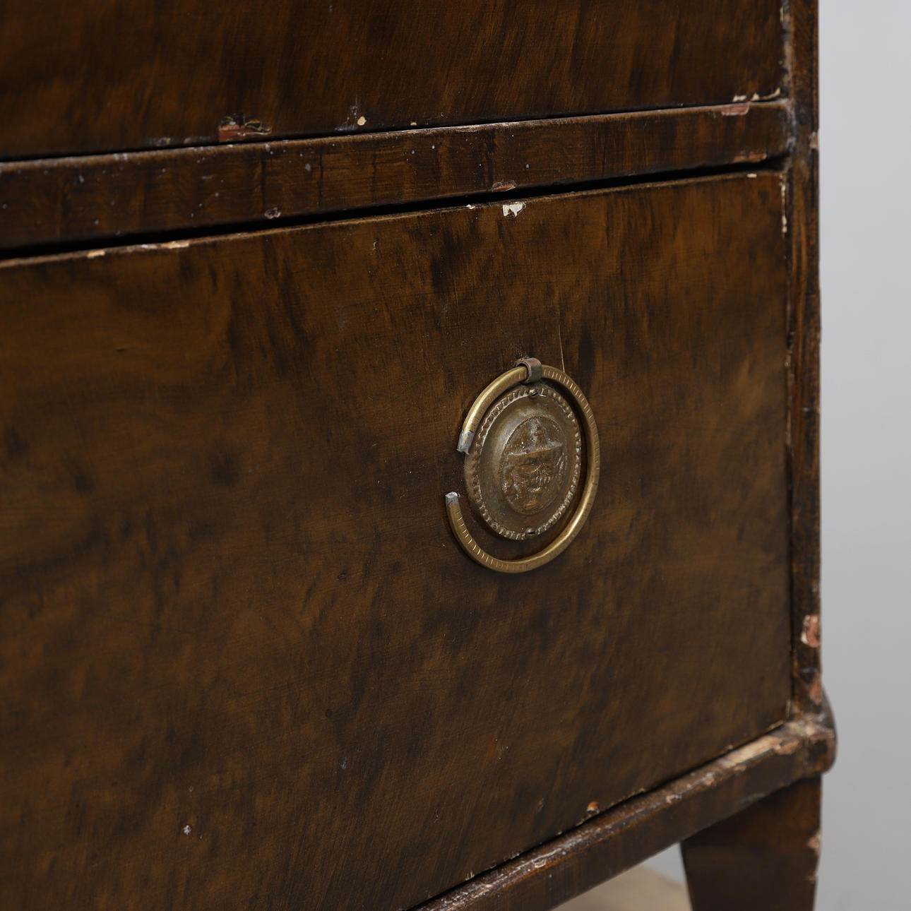 Ådringsmålad. Beslag i mässing. Längd ca 99, bredd 50, höjd 79 cm.